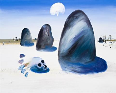 signed lower right: Arthur Boyd inscribed verso: Rocks/ And Skull/ With Flowers