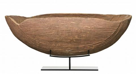 unusually large, of ovoid form with fluted designs to the interior and exterior, applied red ochre pigments throughout