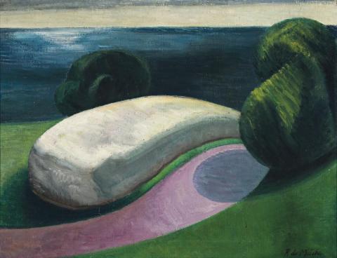 In London some years later, de Maistre returned to this painting as the inspiration for The Great Stone, 1932. Heather Johnson, in her monograph on de Maistre's English years, noted, 'Rather than being a variation of the first work, as was the case with most of de Maistre's reworking of paintings, The Great Stone is totally removed in subject and feeling from the original painting.'1 The flowerbed, she said, had 'become a surging, spiritual, abstract power.' The force of its imagery was not lost on others. The reviewer for the New Statesman wrote of de Maistre's 1960 London retrospective exhibition at the Whitechapel Gallery, '...for me the most compelling images here are two early works, The Great Stone, 1932, and The White Towers, 1934, romantic visions of simple massive static forms pregnant with mysterious force.'2 Like the European Symbolist paintings of the end of the nineteenth century, a work of this kind can lead several ways in imagery and intent. First, there are the various interplays - between flatness and the tactile, sculptural feeling, which are allied to the intentional ambiguity between realism and abstraction as parallels to the symbolism. Then there is the intriguing metamorphosis of the flowerbed, its symbolism being so oblique that it is hard to define. As the dominant form, perhaps that is the point - sculpturally static, curvaceously flowing in the best paradoxical manner of symbols. The Great Stone is a more intellectually intuitive painting. The harmony between and fundamentalism of the forms invite meditation on the same - of reasoned intuition leading to deeper levels of contemplation and perception of the verities.