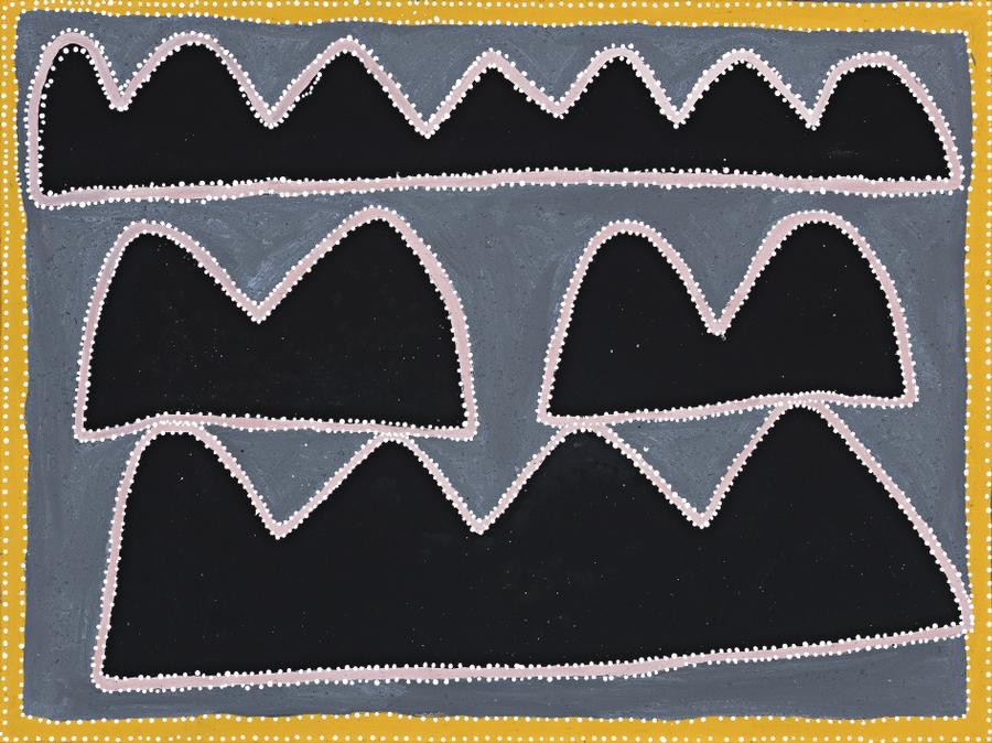 This painting is accompanied by a certificate of authenticity from Red Rock Art which states: 'Yoonoor Country is situated between Texas Downs and Mistake Creek Stations in the East Kimberley. One of the artist's dreamings, "Snake Dreaming" is associated with this country. In the dreaming the snake that made all the country travelled through here. She set off from the sand hills at the top of the painting, she kept going up and down the hills looking as she went.She climbed up the hill called "Wabngayirriny" (bottom left) where she looked back and saw all the hills she had made. Then she climbed up Jawoorroogii and Jimorabji (at the bottom of the work). When she got to the fourth hill called Darrgayil she camped at the spring with her niece and then listened to all of the hills she had left behind talking. She said to her niece "you and me won't wait for them." After that she climbed up behind Darrgayill and made a big waterhole called Larrini where she stayed for good.'