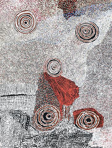 Bill Whiskey's art deals almost exclusively with the ancestral white cockatoo story from his birthplace of Pirupa Alka, about 130 kilometers south of the Kata Tjuta (The Olgas). The story focuses on three birds - the white cockatoo and his friend the eagle and their adversary, the crow. Characterised by great subtlety and chromatic brilliance, Bill Whiskey's paintings map out the compositional elements of the story. Then in a painstaking manner, these elements are surrounded by a great multitude of white and coloured dots.