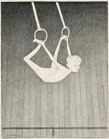Study for 'On the Rings', 1975, conté and pencil on paper, 72.0 x 55.6 cm, collection of the National Gallery of Australia, Canberra illus. in Grishin, S., The Art of John Brack, Oxford University Press, Melbourne, 1990, vol. II, cat. p212, pp. 65, 226