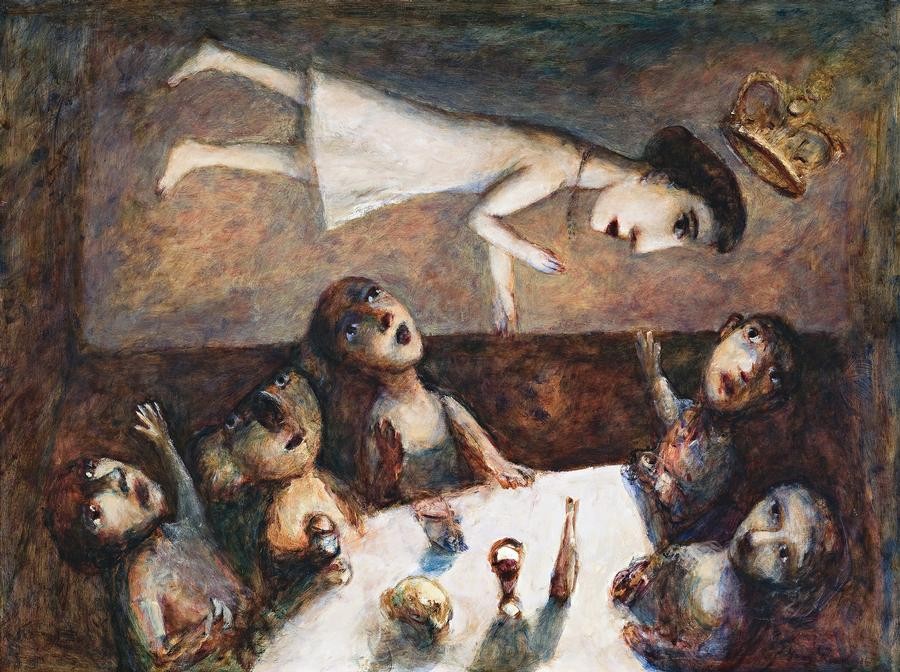 The artist's boyhood fantasies are focused in this painting on a Queen who hovers like a guardian angel over her transfixed subjects, gathered like worshipping disciples around a table, below her. She luminesces in her diaphanous gown, and her crown is a halo, reinforcing her ethereal splendour. Like his all-too-brief vision at the showgrounds, when he was just twelve years old, Garry Shead has depicted his Sovereign as an extraordinary presence who may dematerialize at any moment, but when with her faithful subjects, will do her Royal duty and defend them from all harm.