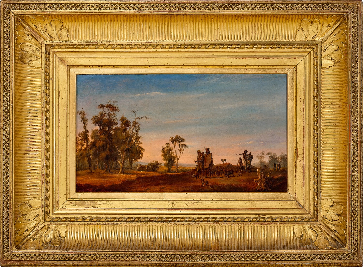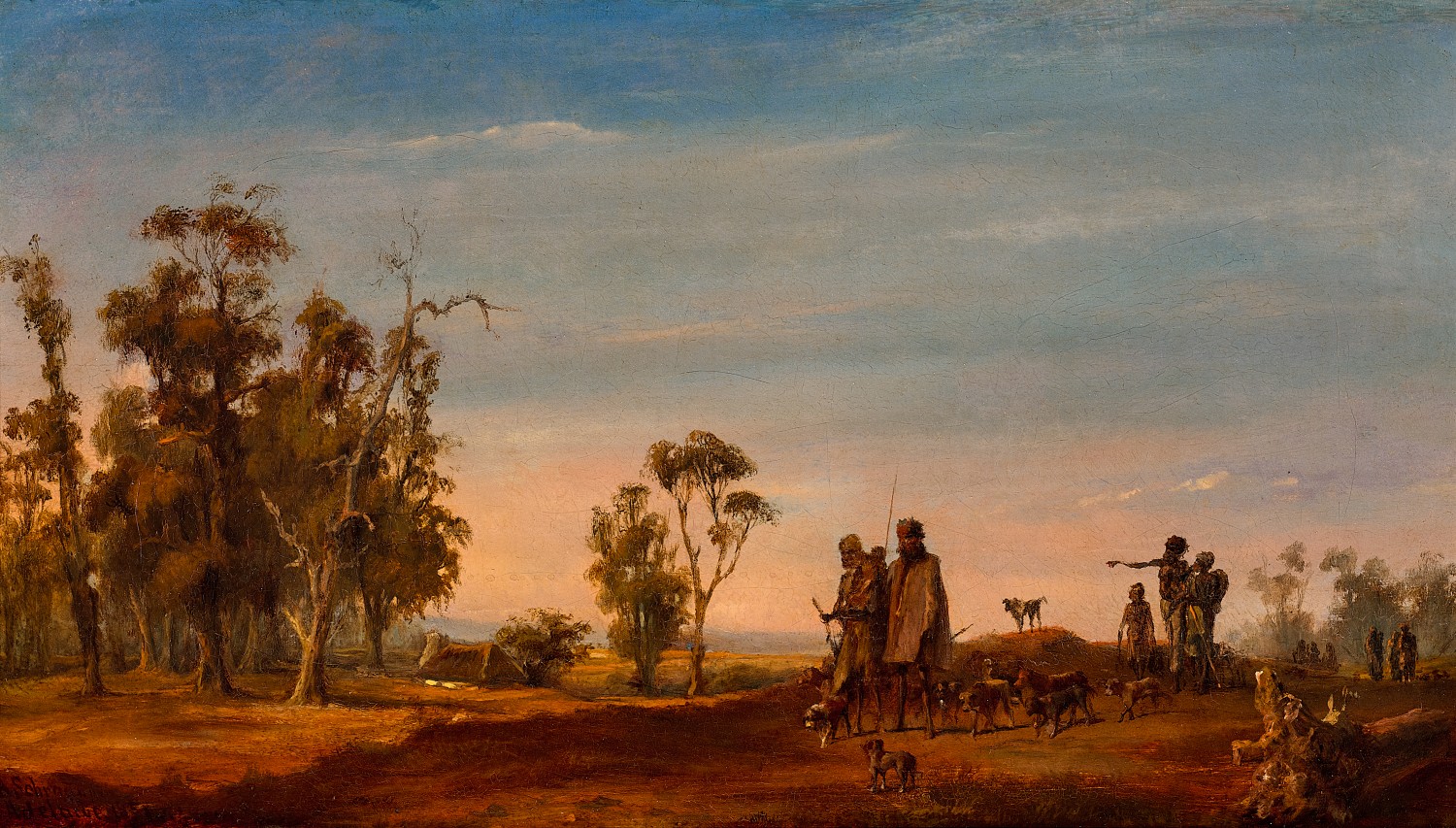 In 1851, barely a year after Adelaide: A Tribe of Natives on the Banks of the Torrens, Schramm produced the work under consideration here. A straggling trail of partly clothed Aborigines with their dogs enters the field of view, arriving at the edge of settlement at sunset. One figure gestures towards a small cottage on a riverbank, overlooked by ragged eucalypts. Individual features are blurred by the sun’s glare, shifting the painting’s register from descriptive to allegorical. The group has arrived at the edge of the colony, and we are all familiar with the consequences.
