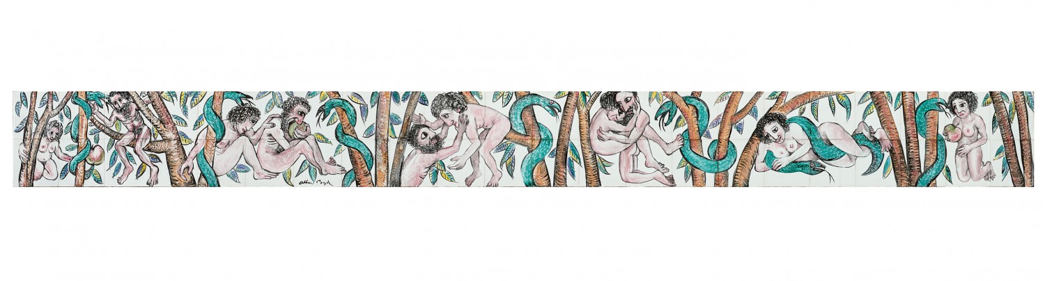 The career of Arthur Boyd is distinguished by his mastery across media, be it painting, drawing, printmaking or ceramics. The son of Australia’s first studio potter Merric Boyd, Arthur learnt first by example, then through his own experimentation on his father’s equipment at the family compound known as ‘Open Country.’ In 1944, he formed his own business, AMB Pottery, in partnership with his brother-in-law John Perceval and their colleague Peter Herbst. Sited in a former butcher’s shop in Neerim Road, Murrumbeena, the pottery utilised some of Merric’s old machinery bolstered by a new gas kiln, stillage and electric wheel. The immediate aim was mass manufacture of utilitarian crockery to meet the demand caused by wartime shortages but once released from these restrictions, they set about making earthenware to their own design with under-glaze painted decorations featuring flowers, animals and joyous, boisterous scenes. Concurrently, Boyd was also painting significant works such as The Mockers (Art Gallery of New South Wales) and The Mourners (private collection), both from 1945, based on biblical stories inspired in part by his grandmother’s practice of reading aloud ‘from an illustrated bible, the tinted engravings in the text being as marvellous as they were bizarre, often even gruesome.’1 The frieze Adam and Eve, 1950 – 52, reflects all of these sources.