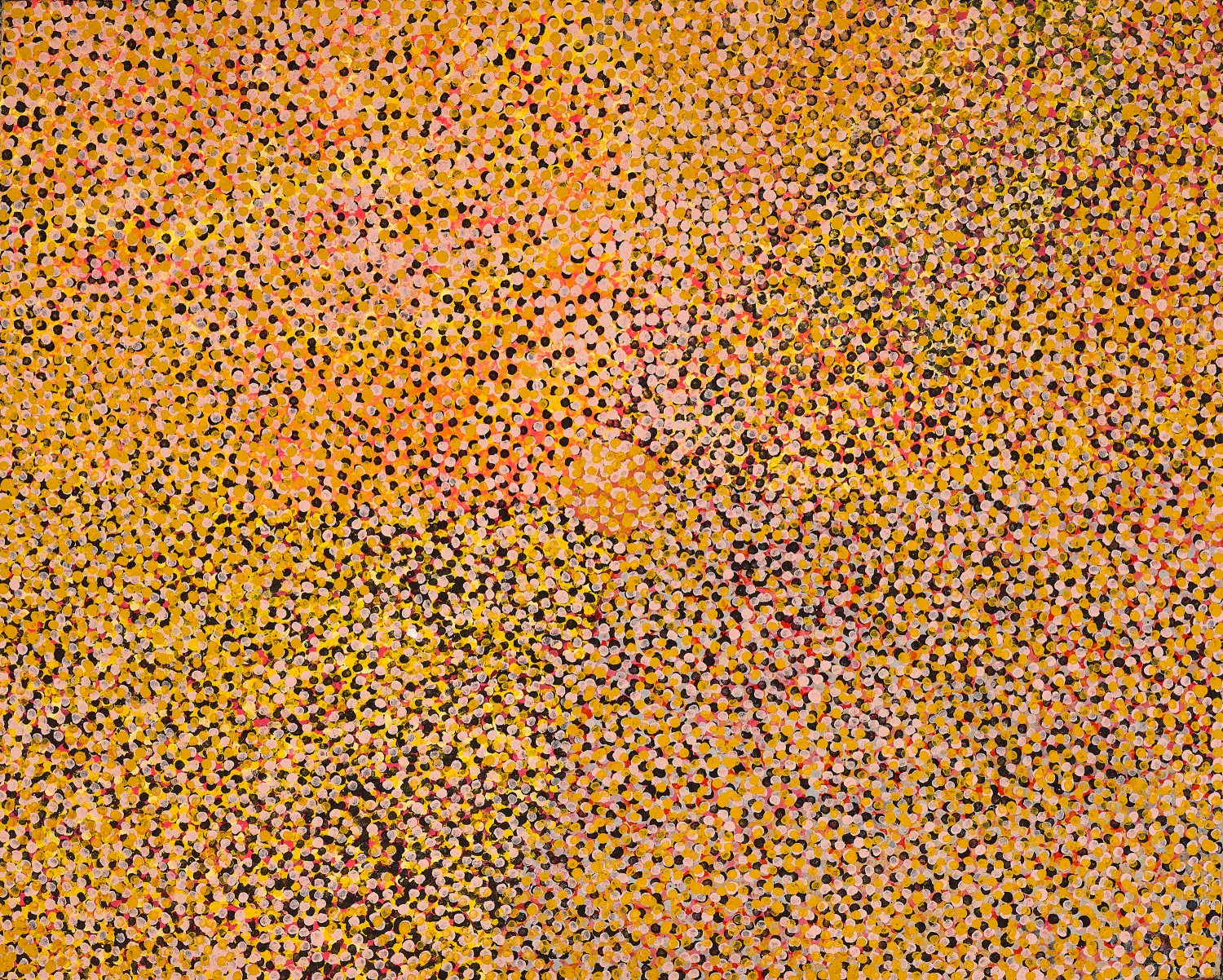 The paintings produced by Kngwarreye between 1990 and 1992 featured finely stippled, shimmering clouds of dots, each individually painted with a small brush in clearly delineated colours – an extraordinarily concentrated effort for an elderly painter. This was soon to change, the artist’s imminent adoption of larger brushes and broader brushstrokes driven by the need to accommodate reducing levels of energy and diminishing eyesight.5 In Alalgura – Emu Country, the fastidious all-over dotting of uniform size, submerges the underlying tracery of dreaming lines. Instead, successive waves of overlaid dots provide tonal variations, with colours coalescing in streaks and patches beneath the dots, providing a sense of depth. The increasing reductionism in her painted works coincided with Kngwarreye’s reticence to provide explanations for her artworks – a reductive story incapable of encapsulating the ineffable interconnectedness of land, natural energies and cultural expression found in her practice. While certain hues refer to specific natural phenomena, such as the changing ripeness of yam seeds, the whole composition of Kngwarreye’s artworks is more expansive, representing on one plane the flux of seasons, the land and the sky. Hers was an art of multiplicities, of a ‘wholeness of experience.’6