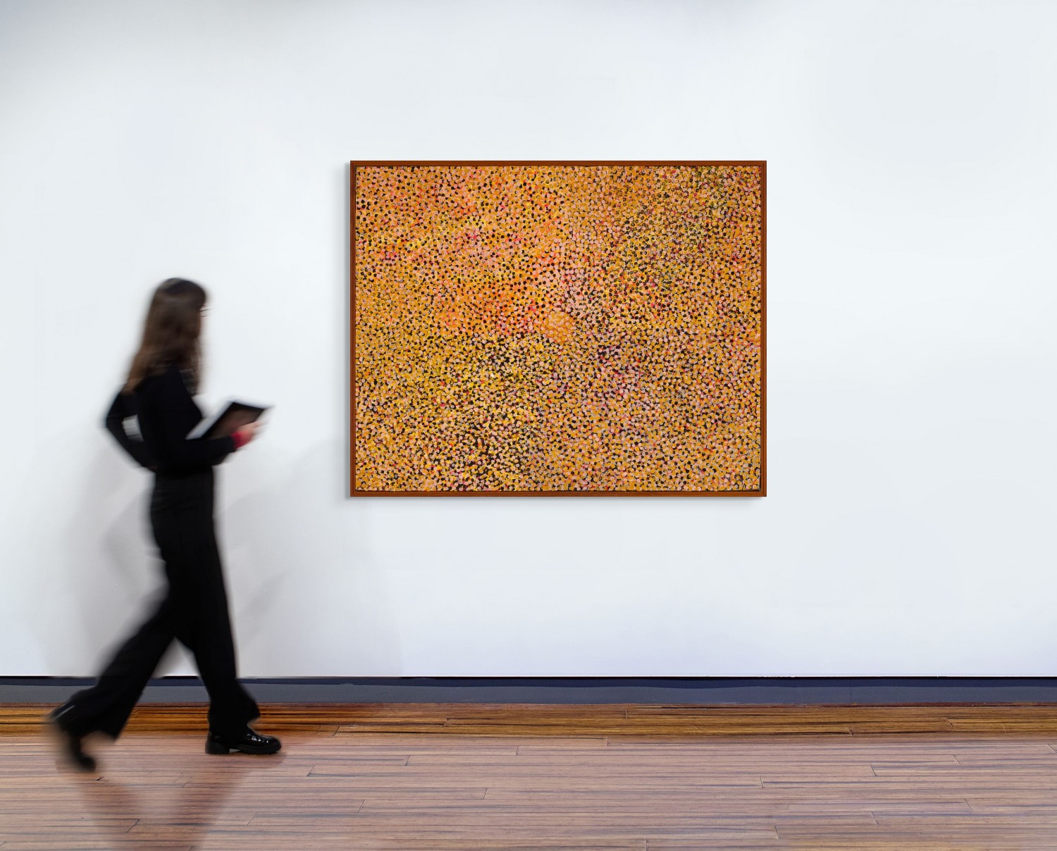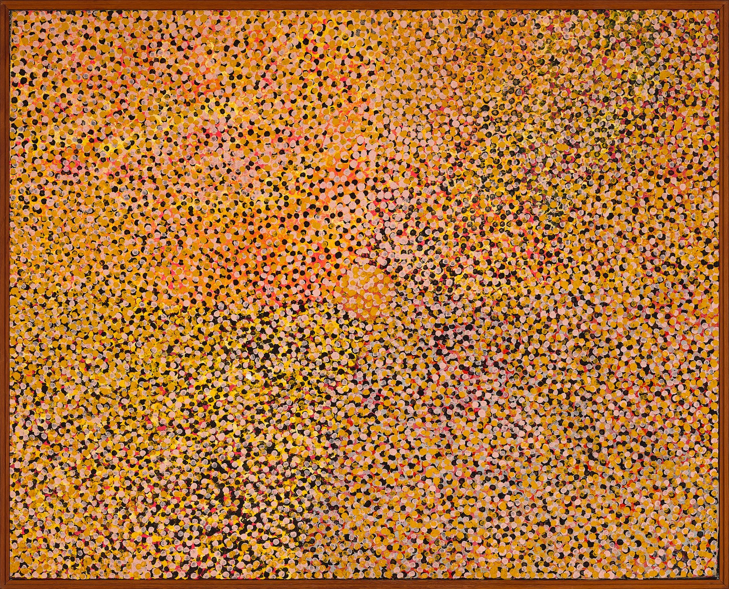 A dense and radiant veil of finely dotted pink, orange, yellow, blue, and burnt umber flowers and seeds, Emily Kam Kngwarreye’s Alalgura – Emu Country, 1992 is a joyous and lyrical explosion of high-key colour signifying a bountiful harvest in Alhalker Country, the site of the artist’s birth. In 1992, although only three years into her brief, yet prolific, professional painting practice, the diminutive 80-year-old Kngwarreye received from Paul Keating an Australian Artists Creative Fellowship – an award affectionately known as a ‘Keating’, recognising the cultural contributions of twelve leading contemporary artists. Noted in the press as a ‘surprise’ recipient, having won without an application, she was the first Aboriginal Australian to be recognised for this honour.1