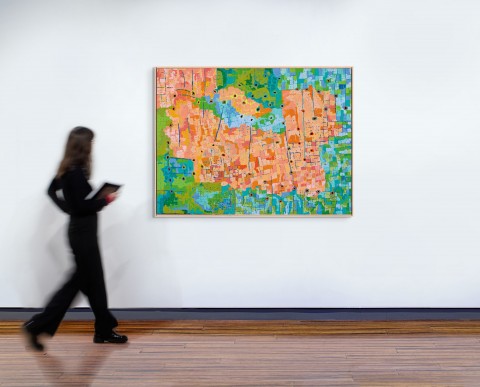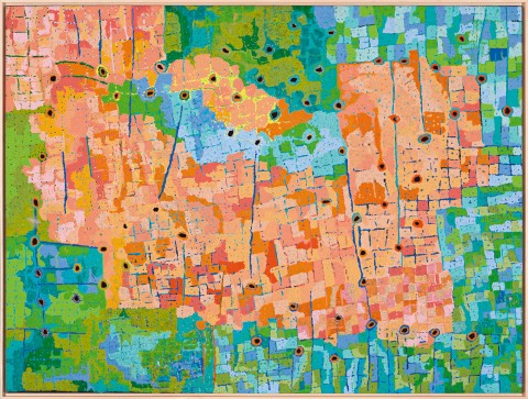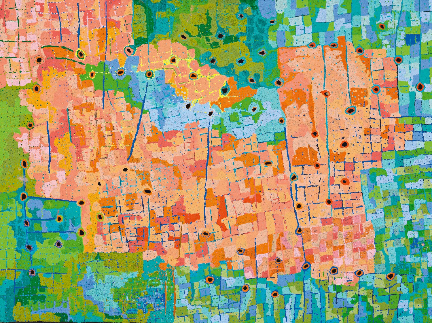Completed later that same year, All the jila, 2007 maps the network of freshwater sites at Karrparti, Kawarr, Jurntiwa and Wirrguja, rendered in a vibrant tapestry of colour and form that would become a hallmark of Walbidi’s practice.