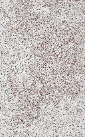 ‘This painting refers to Bamurruŋu, a sacred and solitary rock in Trial Bay. It is a white dome in the Bay - a round lump of granite its top coloured white by roosting birds, in the painting by the molmulpa or white sea foam associated with turbulent and agitating waters created by particular tide and wind.
