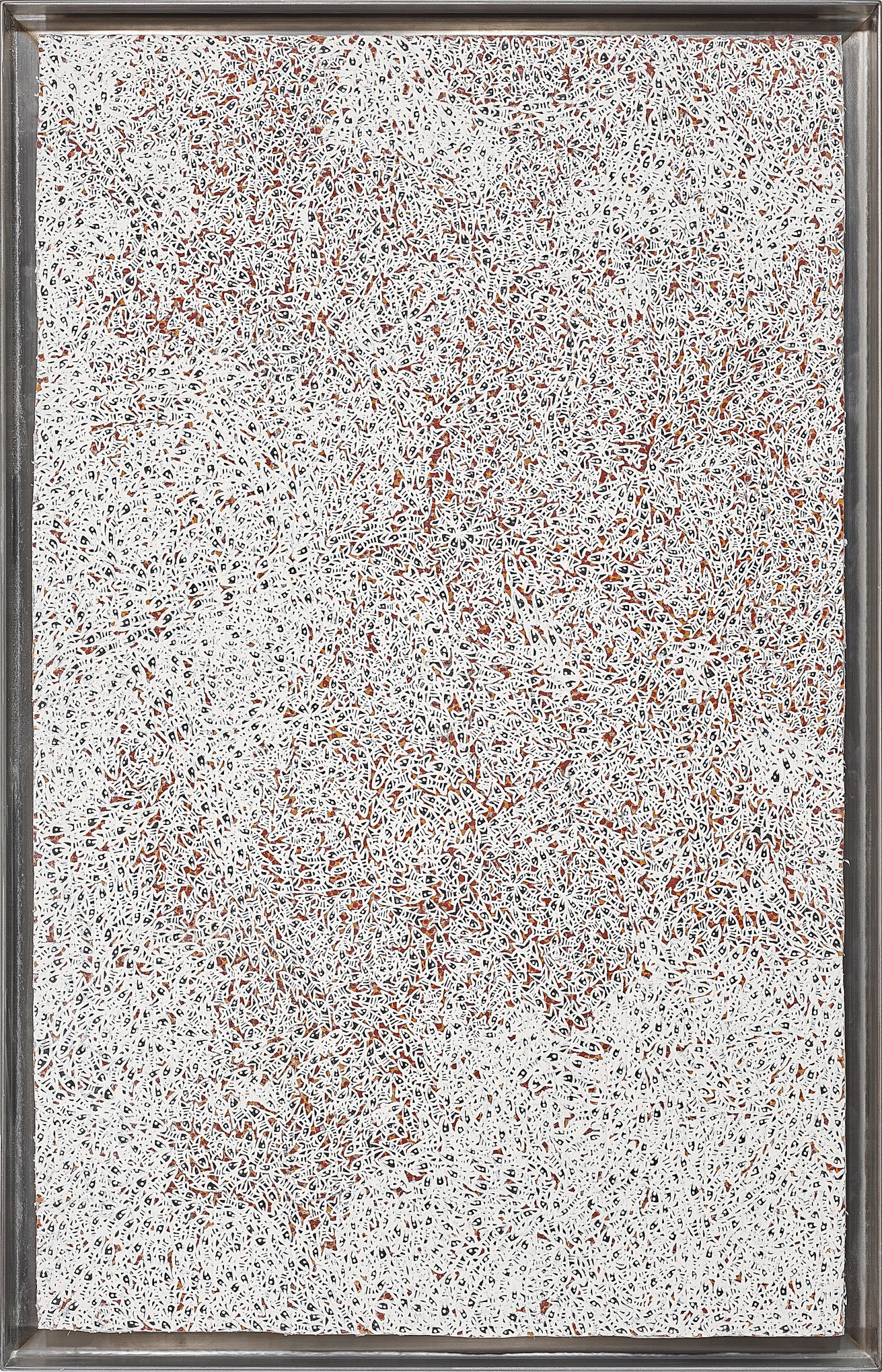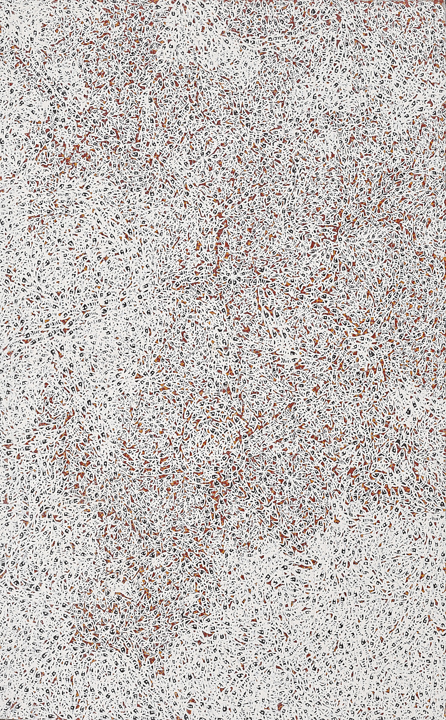 This work depicts the water clashing as it plays and mingles with that of the Djapu and Dhapuyŋu clans. This Balamumu oceanic salt water rushing into the bay creates eddies, currents and patterns that delineate the relationship between the Djapu and Marrakulu clans. This relationship is referred to as Märi-Gutharra. The maternal grandmother clan and its granddaughter. These waters are in this relationship as well. This is known as the ‘backbone’. One of the key relationships in a complex kinship system whose reciprocal duties are most powerful. These clans are both Dhuwa and share responsibilities for circumcising and burying each others clan members. A matriarchal analysis of the world that governs the behaviour of both sexes equally.’