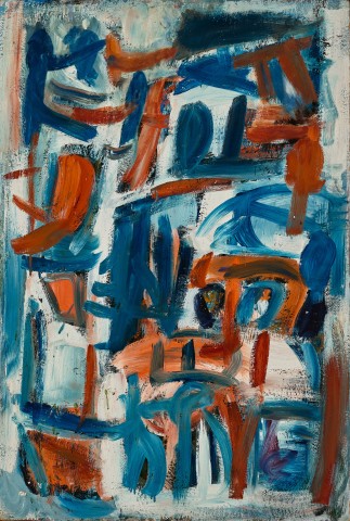 The rhythmic spacing of blue and red lines, both straight and curved, across the scumbled white surface of Blue and red retain the distant memory of earlier figurative compositions, both from the Cocktail for two series and his De Kooningesque female nudes, one of which was exhibited as cat. 1 in the same exhibition at Watters. The process of abstraction from figures into a flat schema of shapes had been developed from a series gouache on paper works in similar saturated tones throughout the mid-1950s.