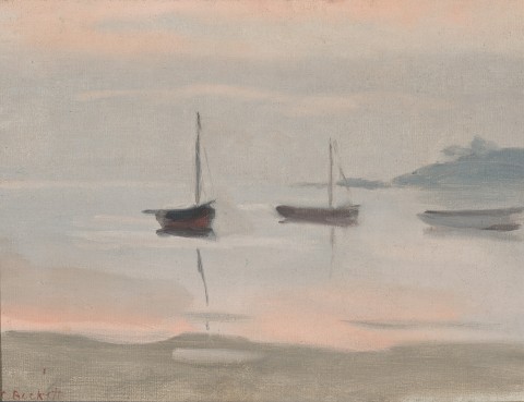 Rickett’s Point extends into Port Phillip Bay, twenty kilometres south of Melbourne. Long a place of sun-seeking pleasure for families and children, it is characterised by extensive sandstone platforms which hide secluded caverns and under-rock ledges hosting sponge gardens. The nearby cliffs reveal numerous shell middens and hand dug wells created by traditional owners, the Bunurong. Beckett lived nearby in Dalgetty Road and a number of her paintings feature the Point’s many moods at varied times of the day and in all kinds of weather, thus also capturing an environmental record of the changing coastline. Boats at Sunset is set in a deepening dusk, alive to the interplay between the natural forms and three small fishing boats tied up for the night. Comprising a fluid array of greys and soft apricot, the painting is imbued with atmosphere and contemplative silence, the far rock ledge dissolving in the fading light. The slightest touch of burnt oxide animates two of the hulls. Meldrum considered Tonalism to be a science and in this painting, Beckett follows his method of close observation, articulating the scene as passages of rich tone. She painted swiftly, with the brushwork flat and the paint thinned, thence smoothed into the canvas.