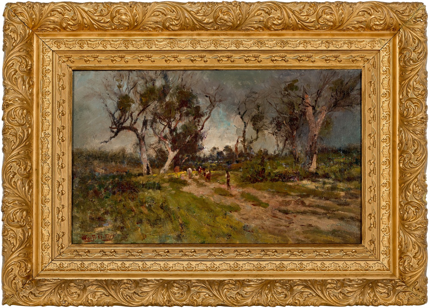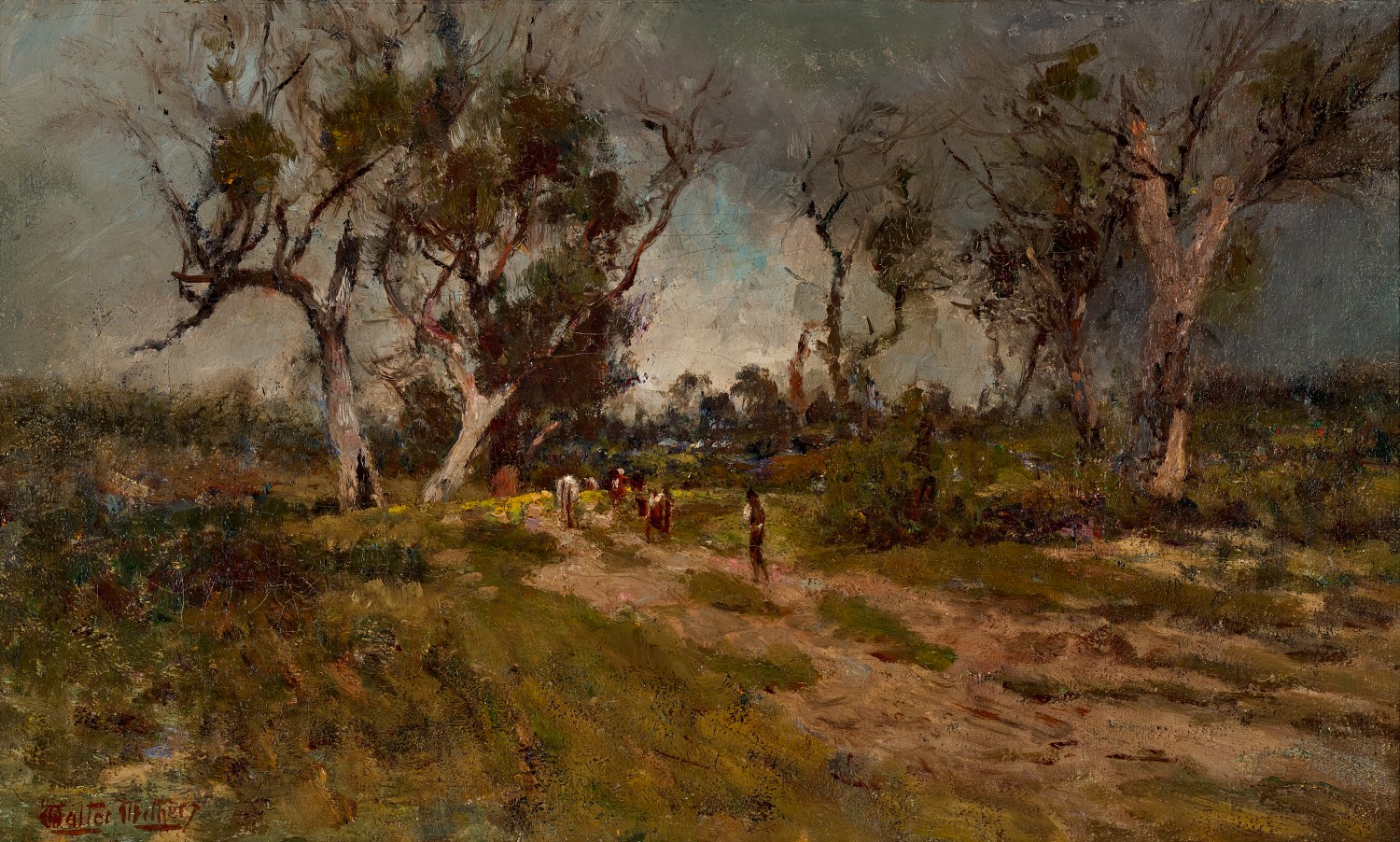 The English-born Withers first trained in London at the Royal Academy of Arts before emigrating to Australia in 1883. For the first eighteen months, he worked as a jackaroo on several country properties ‘but the eucalyptus had got into his veins and Australia claimed him.’3 In 1885, he began further studies at the National Gallery School under George Folingsby, where a fellow student was Tom Roberts, recently returned from Europe and eager to apply his newly acquired plein air enthusiasm to Australian landscape painting. Folingsby famously declared that ‘the man who paints landscape in the open air is a fool’4; he didn’t necessarily dismiss outdoor sketching but preferred a studio finish to the final piece, a strategy that Withers pursued in works such as Coming storm. The setting was near his home in the Melbourne suburb of Heidelberg which was then ‘very much like a small English village, with fruit trees and English gardens surrounding the old homesteads.’5 These in turn were bordered by farm lots and the sight of farmers walking their herds was common. Despite the artist’s close association with members of the Heidelberg School, A coming storm shows the strong influence of John Constable’s low-toned, lyrical landscapes of the English countryside – although areas of broad brushstrokes in the foreground invite comparisons with Arthur Streeton, whilst the stark white gum trees could only have been painted through responsive ‘Australian’ eyes. With the lower clouds of the tempest backlit by the sun, the lone farmer urges his small herd to safety in a scene that will soon be transformed by wind and rain. Following Folingsby’s directive, A coming storm would no doubt have begun as a plein air sketch before being fleshed out to its final version within Withers’ self-built Heidelberg studio.