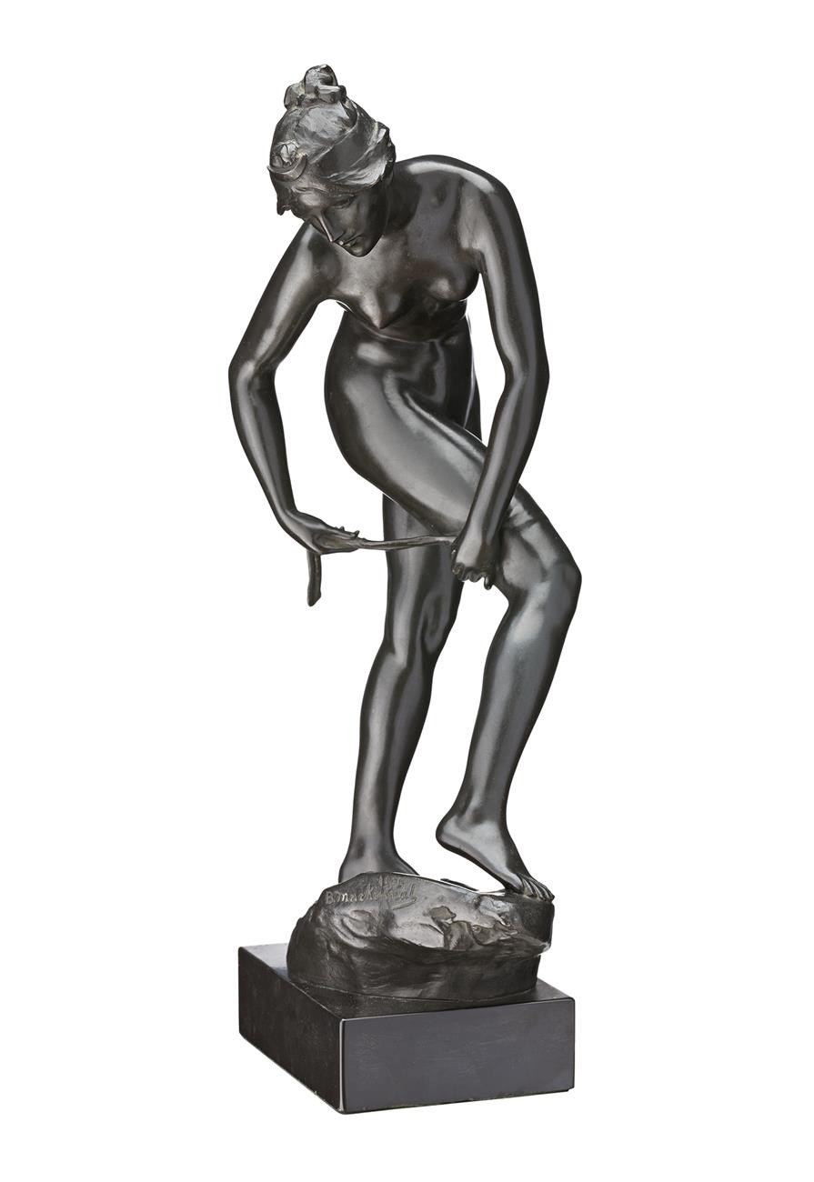 Diana, in Roman mythology, was the moon goddess of the hunt and birthing, equated with the Greek Artemis, daughter of Zeus and brother of the sun god Apollo. Jupiter gave Diana permission 'to live in perpetually celibacy' and, as 'the patroness of chastity', 'to shun the society of men'.2 Mythological references are avoided in Mackennal's bronze. 'Diana Wounded is even more tongue-in-cheek. The vicious Roman moon goddess in Ovid's Metamorphoses is inverted. It is she, not the quarry Damasichthon, son of Amphion and Niobe, who is injured in the leg'.3 Taking into account the association of 'Diana' with 'heavenly' and 'divine', Mackennal carried this further. Divine in looks rather than status, she is a sight perilously tantalising to the mortal male. The action of bandaging her thigh, inspired by the more explicit sight of 'a model doing up her stocking', effectively enabled the artist to show off her bodily attributes without loss of modesty.4 This teasing play between the appealing and the unobtainable epitomised that beguiling blend of poise and pleasure so typical of la belle époque and its English Edwardian counterpart. Although calling freely upon ancient Greek and Roman sculptures of the goddess of love, Aphrodite and Venus, she is a thoroughly modern Edwardian maiden. Effectively using the contrappostal pose, Mackennal created an ideal image endowed with grace, but sensuous of modelling. When Mackennal made a marble life-sized version in 1907 – 08, he crowned Diana with her crescent moon. It was smartly acquired by the Chantrey Bequest and given to London's Tate Gallery in 1908. The Times called it 'one of the most beautiful nudes that any sculptor of the British school has produced'.5 The artist thought it one of his best works too.
