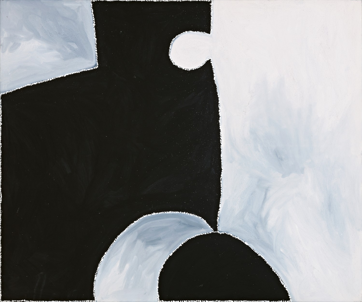 Stylistically, this painting marks Bedford’s departure from the more familiar conventions of earlier East Kimberley painters, as he forged a highly personal vision of country. The introduction of a stark black-and-white ground signals his evolution from a purely ochre palette. Solid forms assert themselves within the composition, while washes of soft pink and blue-grey temper the surface through a wet-on-wet process first seen in his canvases in 2003. By suspending white and coloured pigments in an acrylic medium, Bedford achieved a distinctive luminosity and depth across the painted surface.