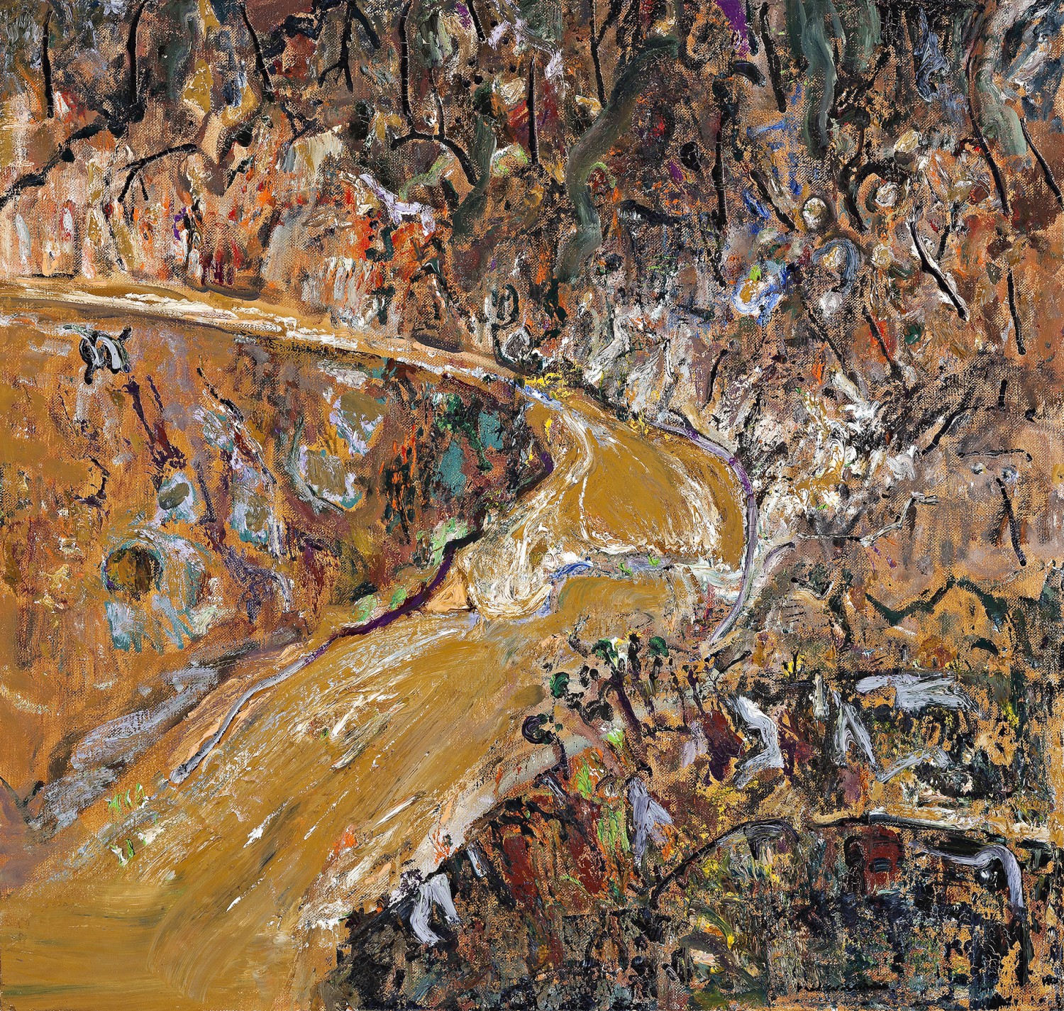 To accomplish his ambitions, Williams, who had never learned to drive, initiated a weekly ritual whereby a fellow artist, beginning with John Perceval, would pick him up on a Wednesday and travel to the bush before setting up their easels ‘rain, sun or cold… [painting] feverishly for six hours.’4 In a newspaper interview, Williams said: ‘I accept any spot as a challenge. I find a trigger in the landscape for what I want to do.’5 The canvases would then be reworked wet-on-wet in the studio. Although the locations were usually non-heroic or epic, Williams was by 1976 increasingly attracted to gorges and waterfalls, ‘drawn to an elemental landscape where forces, which shaped the land, could be observed and painted.’6 These developed into what is now known as the ‘Gorge series’ of 1976 – 77, and Flooded creek, 1977, is one of his last responses to the motif before beginning a commission from Comalco Ltd to paint the Weipa district in far-north Queensland. It appears to be a companion to such works as Dry creek bed, Werribee Gorge I (Tate Gallery, London) and The river, Werribee Gorge (Art Gallery of New South Wales), both painted the same year, and is a vivid response to the raging torrent of water engorged by recent rains. A number of the ‘Gorge series’ paintings feature sharply angled bends, described by Patrick McCaughey as ‘the great-angle hooks (whose) wiry, irregular black line uncurves [sic] like a whiplash across the painting.’7 In Dry creek bed, Werribee Gorge I, an ancient creek bed lies exposed, deeply etched into the surface of the land. Although the landscape appears parched, Williams conveys a sense of renewal with signs of life seen in the scatter of plants around the creek bed. Flooded creek may well be from a similar location in Werribee Gorge, likely driven there by artist Fraser Fair – only now the vegetation blooms in response to the sudden amount of water.