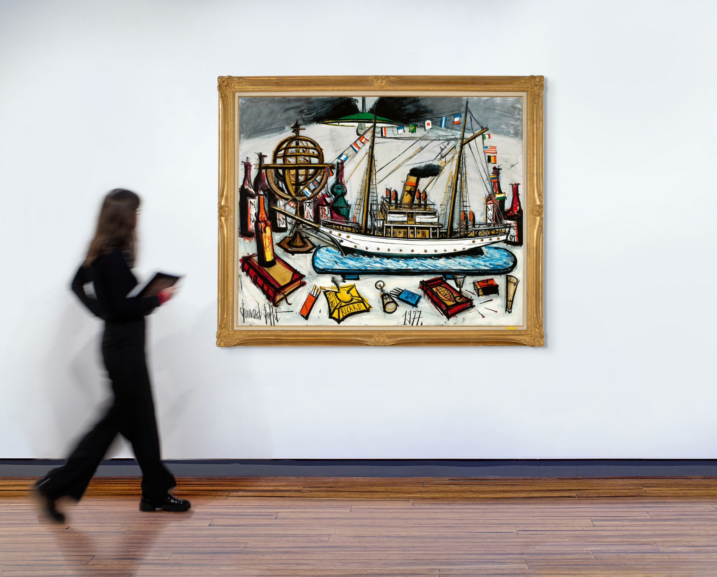 In the early years of the 1970s, Buffet had become increasingly reclusive and feverishly painted sentimental landscapes, many depicting busy harbours of the Breton coast where he had holidayed with his mother in the 1940s. Returning to these maritime themes in his 1977 still lives, Buffet incorporated amongst the relics of his bon-vivant excesses, large model ships – at least four different historical models. Buffet’s library in the château was vast, and purportedly accommodated several large-scale models of yachts and ships from the great days of sailpower.6