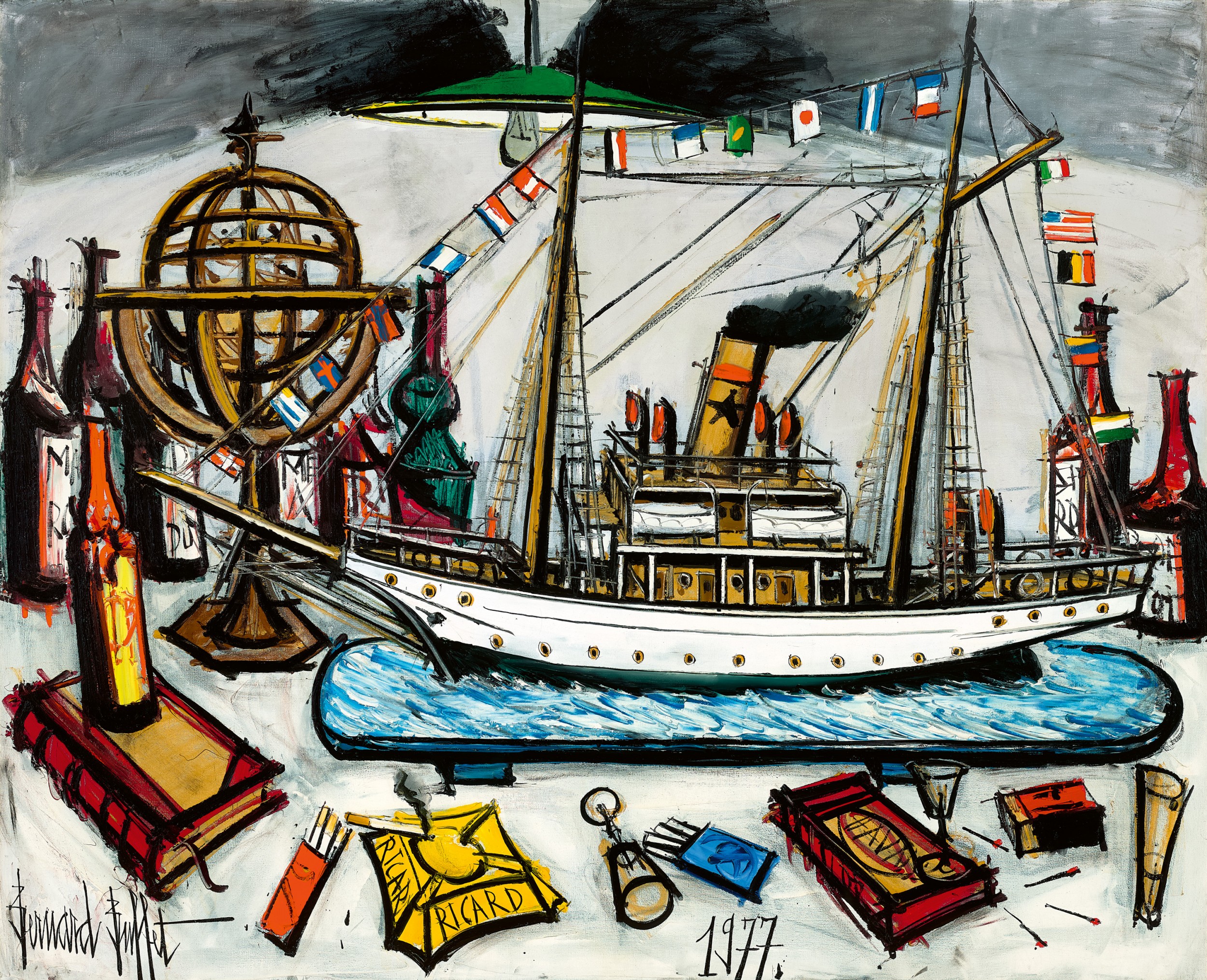 While the title of Hurrah!! Portovenere! contains both an international maritime celebratory exclamation and the name of a picturesque Ligurian port, the relationship between this title and the model of a two-masted steam-powered schooner within the image is unclear. Whimsically, Buffet has painted plumes of black smoke belching from the model ship’s singular funnel, mirroring the plume of smoke from his own unfinished Gauloise cigarette, balancing on a bright yellow ashtray advertising Ricard pastis. Further emphasising the celebratory atmosphere of toasts and enthusiastic cheers, Buffet’s model ship, gleaming with unpainted white gesso, is ‘dressed overall’. Carefully detailed in the artist’s characteristic graphic style, the ship is decked out with flags in the time-honoured naval tradition for celebrating national holidays, regattas or special occasions. Only Buffet has either misunderstood or taken creative liberties with this custom, painting instead of the required international signal flags and pennants, an array of national flags including that of France, Italy, Belgium, the United States and Japan. Accompanied by a stylised globe on a stand, Buffet is perhaps alluding to his increasing global fame and reflecting on his inability to meet it. In 1973, when a museum in his honour had been inaugurated in Japan, Buffet had declined an invitation to attend, writing in apology ‘do not take my absence as a sign of indifference – I am a solitary person’.7 Buffet’s son believed that while his father had thought it morbid and premature to memorialise him with a dedicated museum during his lifetime, he regretted his absence from the celebrations for the rest of his life.8