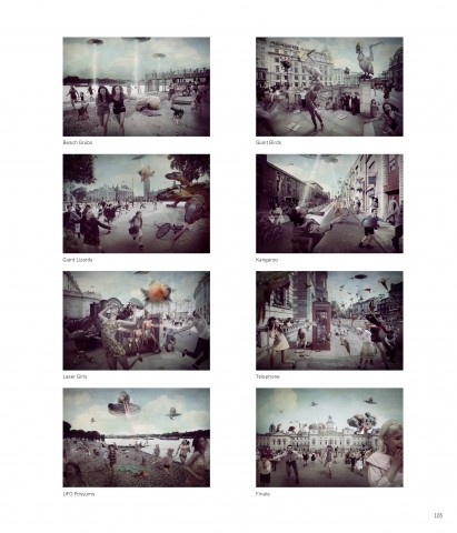 Cook’s photomontages present a pastiche of grainy textures and unsophisticated special effects inspired by B-grade sci-fi movies. Cut-out flying saucers hover in Cook’s grey English sky, carrying large possums, or depositing the various invaders on shore with luminescent tractor-beams. Laser-beams shot from the bellies of these spaceships create massive explosions on land, clouds of smoke and fire emanating from the roofs of Big Ben and Somerset House, mimicking the action-movie trope of an explosive Armageddon finale and uncomfortably evoking the ‘Blitz’. While the artist has explained that the kernel of inspiration came from Alfred Hitchcock’s seminal 1963 film, The Birds, and initially intended to include swarms of birds in every frame, the popular culture references and the strong relationships they have to real-life historical events can be traced to much earlier foundational texts.2
