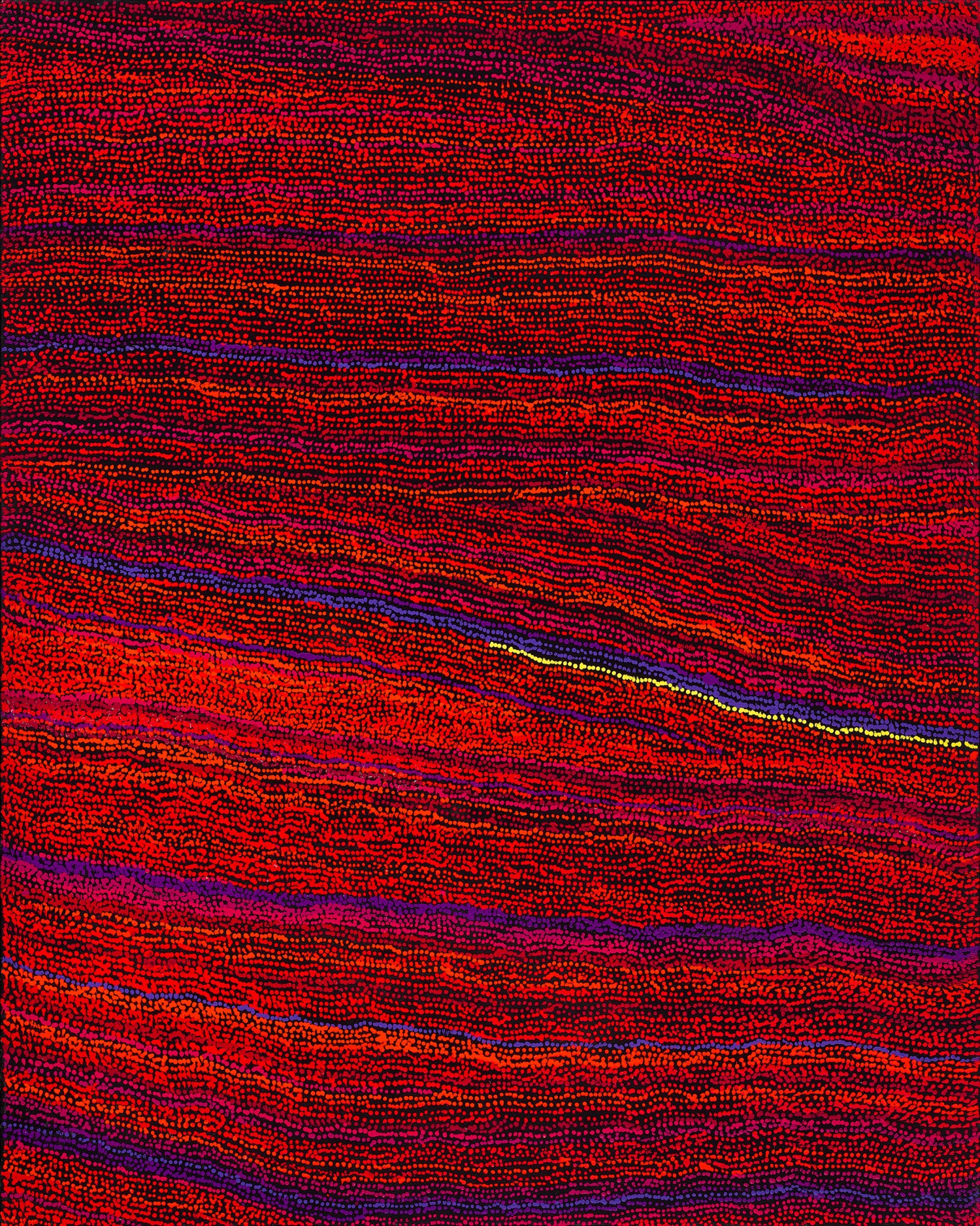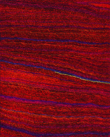 'Kata Ala Is my country near lrrunytju in Western Australia. Tjukurpa tjuta (there are many creation stories) which cross over close to this place. Mlnyma mutu mutu, nyii nyii tjuta (the creation story for all the small bird women, zebra finches) and the man wati Nyiiru (from the Seven Sister's Tjukurpa) is close by and Wati Kutjara, the two serpent men from Pukara came here. At Kata Ala there are three places where we dig to find water just below the surface. I spent a lot of time In this country when I was a child.'