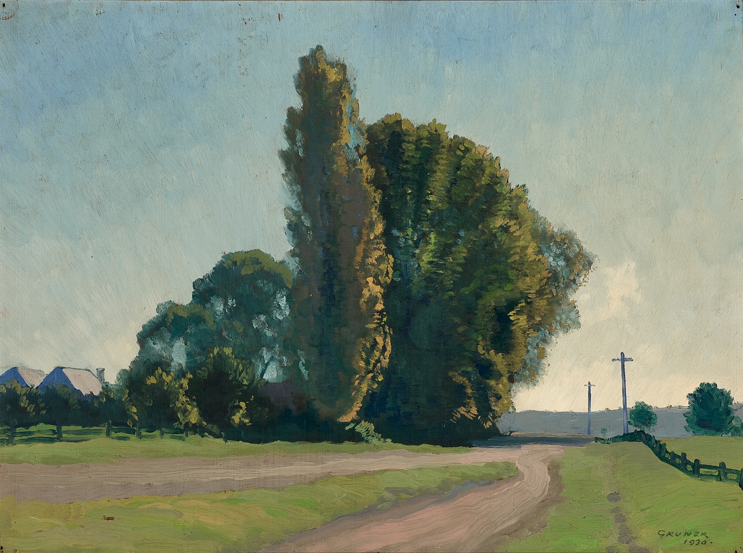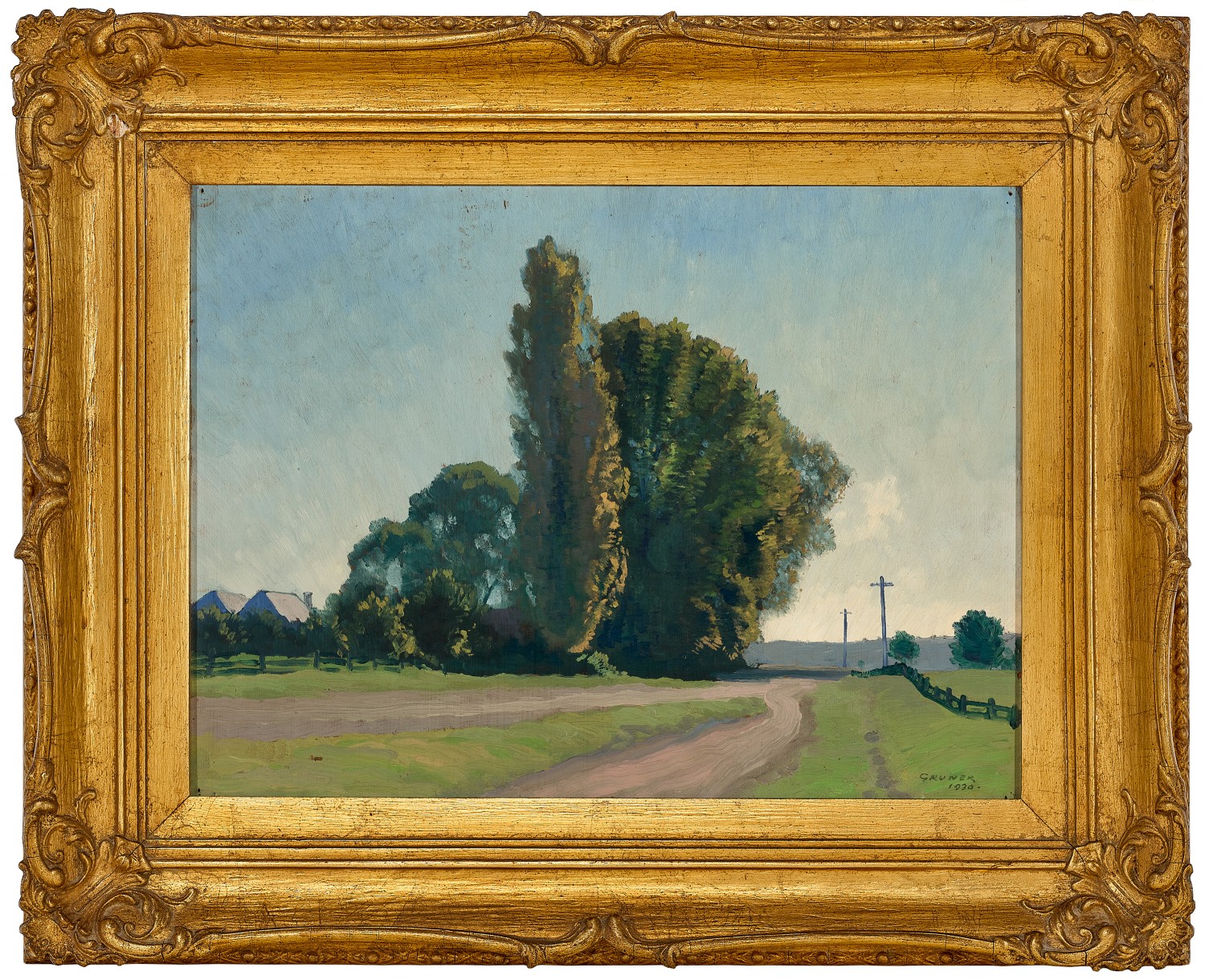 Buoyed by his success, Gruner undertook an extended drive through the south coast of New South Wales and on to the Gippsland region of Victoria where he painted Mitchell River, Victoria (aka Gippsland lakes), 1930. Following this, he travelled back to Melbourne and by May, was in regional Bacchus Marsh on Woiwurrung and Wathaurong country. Notably, he was in the company of two significant artist-educators – namely, George Bell, who would open his renowned modernist school two years later, and Daryl Lindsay, member of the famed artistic family and future Director of the National Gallery of Victoria.3 This was a working holiday charged with much intellectual discussion and analysis, and contemporaneous paintings by each bear witness to shifts in emphasis and technique. It is interesting to compare Lindsay’s and Gruner’s paintings in particular. Although both exhibit a marked flattening of space, in works such as Lindsay’s Landscape at Myrniong, c.1930, and Landscape at Bacchus Marsh, c.1930 (both in the collection of the National Gallery of Victoria), the brushwork comprises stipples of impasto strokes whilst the skies are filled with highly mannered clouds. By comparison, Gruner’s paintings from Bacchus Marsh demonstrate the continuing strength of his vision. In the lot on offer here, the majestic poplar and companion oak provide a central focus, whilst the forked roads lead the eye back to the foreground, bracketed by the boundary fence to the right and two small cottages at the left. However, it is the sensual pleasure that Gruner expresses with his sky and clouds that truly completes the image. Taking cues from other modernist contemporaries such as Grace Cossington Smith (see Gum Blossom, c.1928 – 32, Deutscher and Hackett, Melbourne, 28 August 2024, lot 49), the blue brushstrokes radiate to the heavens, while the clouds on the horizon impart a true sense of reality. Indeed, Gruner himself was also impressed, writing to the critic Basil Burdett that he had ‘painted a sky at last.’4