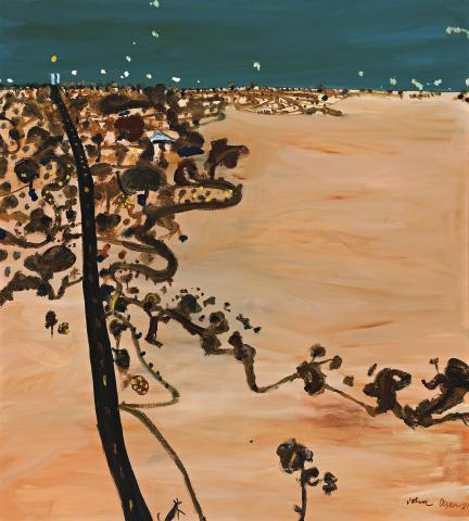 John Olsen’s Mallee Road to Nhill I, 1981 is an evocation which distills the essence of a traveller’s experience through Victoria’s Wimmera region. With the endless tarmac of the Western Highway leading the eye and the arabesque twists of the Wimmera River chiming in, the bustling township of Nhill beckons ‘with a silo like a cathedral dominating the town.’1 Although he had painted the region earlier in the late 1960s, Olsen was now having a far more immersive experience having recently relocated to Clarendon, ‘a small hamlet … in the cleavage of two hills’2, a short drive out of Adelaide. Here, he set up his new studio in the main street in the historic Institute Building dating from 1853. This relocation also triggered regular air travel between his new home and the eastern state capitals of Sydney and Melbourne, meaning the artist experienced elevated views of this landscape, an aspect which further informed his painterly renditions.