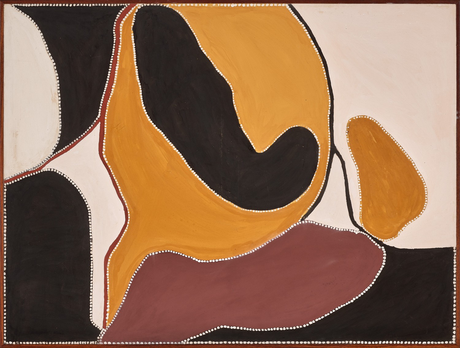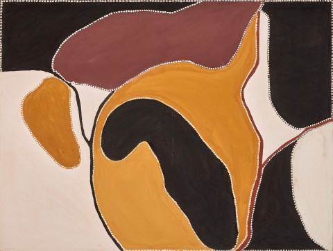 A detailed and intimate working knowledge of the land combined with recollections of distant ancestral places provided the foundation for Timms’ radically stylised artworks. His textural chalky surface of local ochres, carefully contoured with ‘the ubiquitous East Kimberley line of white dots’, contain the soft traces of his lived experience.4 Aged in his early forties, Timms took to painting at the point when Paddy Jaminji’s career was ending, becoming a generational bridge within the Turkey Creek school of painters, and following in Rover Thomas’ stylistic lineage. Like the elder artist, Timms’ early paintings are characterised by a certain graphic austerity: a reduced palette and clearly outlined shapes far removed from human scale. The wide areas of delicately modulated solid colour in hues of brown, ochre and chalk are spare of ornament or detail. They convey with precision an aerial view of this spacious and significant site for the artist, an organic real-world structure which provides a symbolic rhythm to the painted surface.