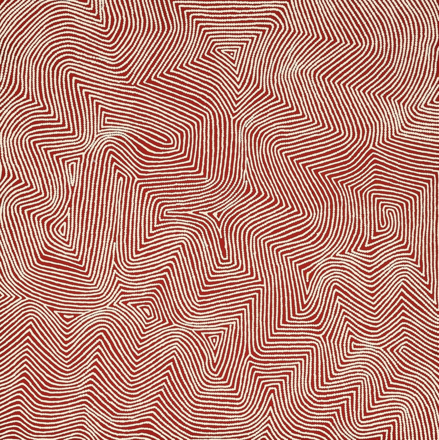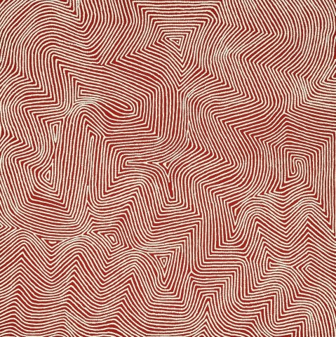 ‘This painting depicts designs associated with Marawa, a swamp with rockhole and soakage water, on the west side of Lake Mackay. In mythological times a large group of Tingari Men travelled to this site from the west and after arriving they went underground. Since events associated with the Tingari Cycle are of a secret nature, no further detail was given. Generally, the Tingari are a group of mythical characters of the Dreaming who travelled over vast stretches of the country, performing rituals and creating and shaping particular sites. The Tingari Men were usually followed by Tingari Women and accompanied by novices and their travels and adventures are enshrined in a number of song cycles. These mythologies form part of the teachings of the post initiatory youths today as well as providing explanations for contemporary customs.’