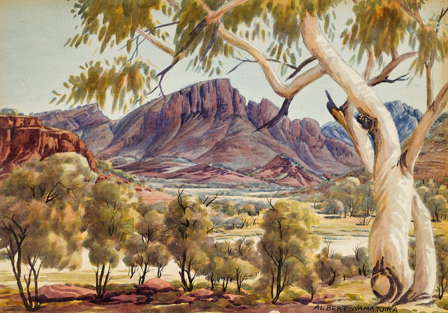 bears inscription on old label verso: Mount Gillan [sic] - MacDonnell Range [sic], "Central Australia" / Original watercolour, by Albert Namatjira (Aranta [sic] Tribe) / Painted for Pearl Stephens, Oct 21st to Oct 28th 1956. / near Albert Namatjira Camp - consisting of a / shelter made of boughs of gums-, his wife, / sons, grandchildren shared the camp.