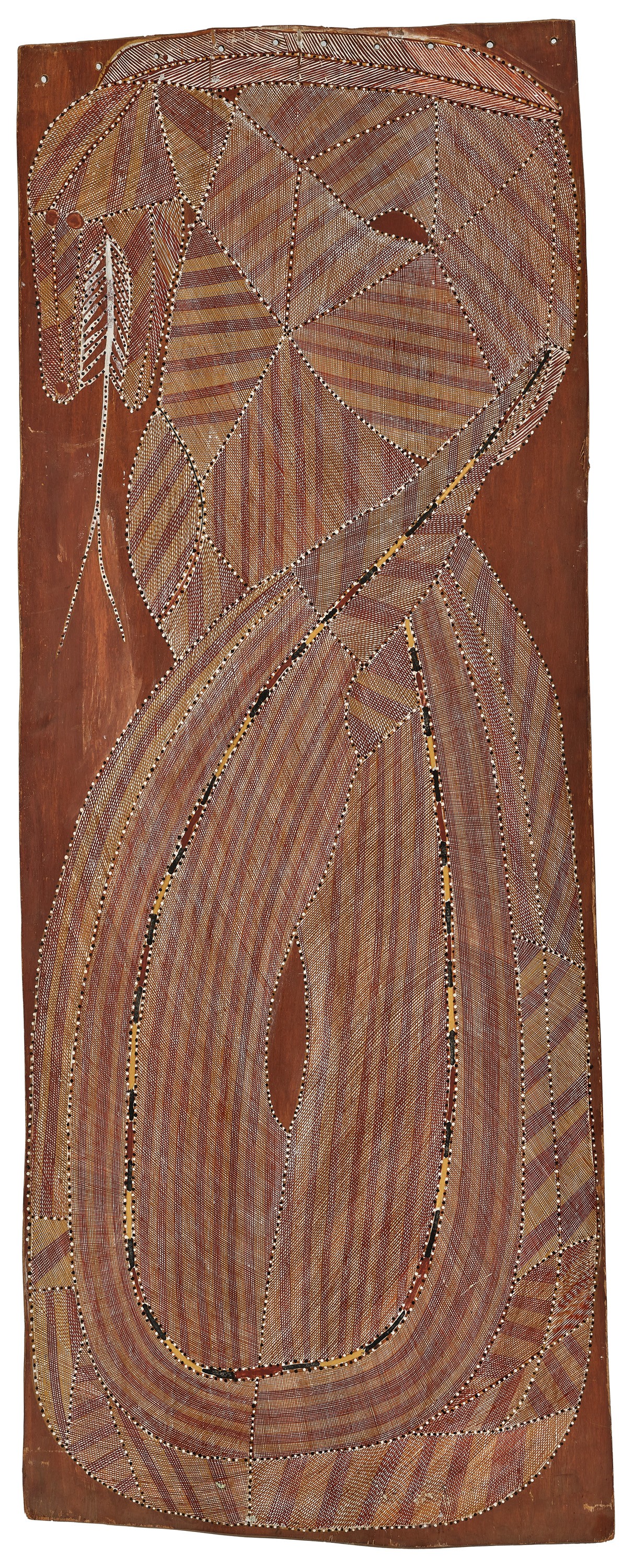 The potency of Ngalyod is powerfully expressed in Ngalyod, Rainbow Serpent, 1979. The serpent’s head, shown in profile at the upper left of the bark, is bordered by fields of ochre rarrk; its teeth are reduced to a rhythmic series of chevrons, while its body twists and coils toward the edges of the bark surface. Energy radiates throughout the composition, signalling a presence imbued with immense power - life-giving in the regenerative rains of the annual monsoon, yet equally threatening in the destructive force of storm and flood.