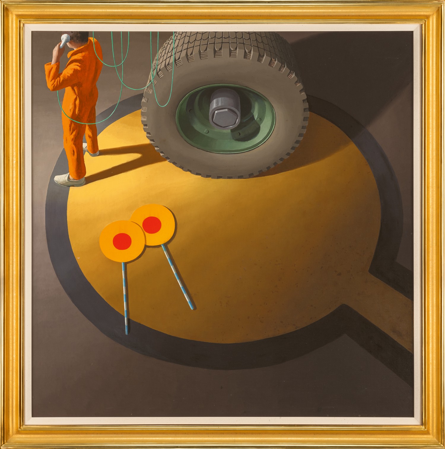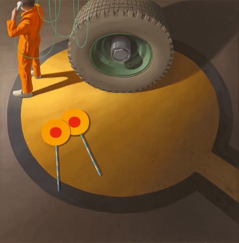 Like a freeze frame of a film, the closely cropped images of Smart’s world are loaded with a sense of intrigue, the suggestion of action existing and persisting just beyond the viewer’s line of sight. Seen from above, Night stop, Bombay presents a bird’s eye view of the tarmac of an airport runway, the larger context of air travel only obliquely referenced. Captured within the target of a yellow circle painted onto the asphalt, Smart paints a worker in bright orange overalls talking on the phone with a looping cable, his back turned to the viewer. Lovingly painted, a massive, disembodied wheel dominates the composition. The dramatic chiaroscuro of light flooding just one corner of the square canvas endows this view with a dream-like vividness. Discarded behind the worker lies a pair of hand-held lollipop markers, with distinctive blue-and-white striped handles – the arcane choreography of air marshalling long having been abandoned. In Night stop, Bombay, Smart clearly delights in the interplay of circles and directional lines, distilling them through the spatial and geometric relationships between the painted road marking, the discarded objects and the giant wheel. The vertiginous view down onto the painted tarmac from the height of an aircraft, disorientingly removes the horizon from view. This device was laboriously refined by Smart many years before in another airport painting of a solitary figure, Madrid airport, 1965 – 66 (private collection). Similar to the tarmac in Madrid airport, which is conspicuously grimy, bearing the traces of the machinery of mass transport, here in Bombay, the yellow road marking is splotched with grease, as Smart noted within his rapid in-situ sketch.
