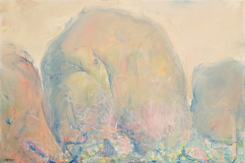 The Olgas – the dawning, 1977, was one of a sequence of canvases he painted after his return featuring the domes at differing times of day. While its companions such as Mid morning – the Olgas, 1977, (Australian National University) place as much emphasis on the expansive skies as the rock formations, in the present work the emphasis is the rounded form of the domes themselves. The painting is also a significant example of the new direction Rees had taken with his technique since 1970, where ‘everything his art had previously stood for was upended in these luminous works. Turner and Monet became his guiding lights and the evanescent, not the enduring, became his theme.’2 The Olgas – the dawning exemplifies this with the monolithic forms executed in atmospheric creams and apricot as they slowly reveal themselves in the radiance of the early morning light, whilst patches of green and pink at their base hint at the hardy vegetation which grow between the rocks. In an article on the exhibition containing these works3, Sandra McGrath pronounced Rees to be ‘a new, mystical master at the Centre’, observing further that he had made ‘cathedrals of the rocks’4, a reference to his lifelong fascination with such buildings (see also lot XX). The sensuous, organic curves also recall paintings done of the Olgas by Rees’s great admirer Brett Whiteley in 1970, and again in 1985.