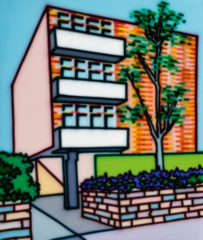 However, despite the work’s joyous high-keyed palette and cloud-free blue sky, the ‘Own Your Own’ of Arkley’s title also points to something far less sunny: the challenges of global capitalism and the ever-diminishing Australian dream of home ownership. The modest apartments of this simple block of flats represent the aspirations of all first home buyers—the possibility of ‘owning your own’ and of getting a toehold in the market—along with the promises this brings of security and happily-ever-afters.