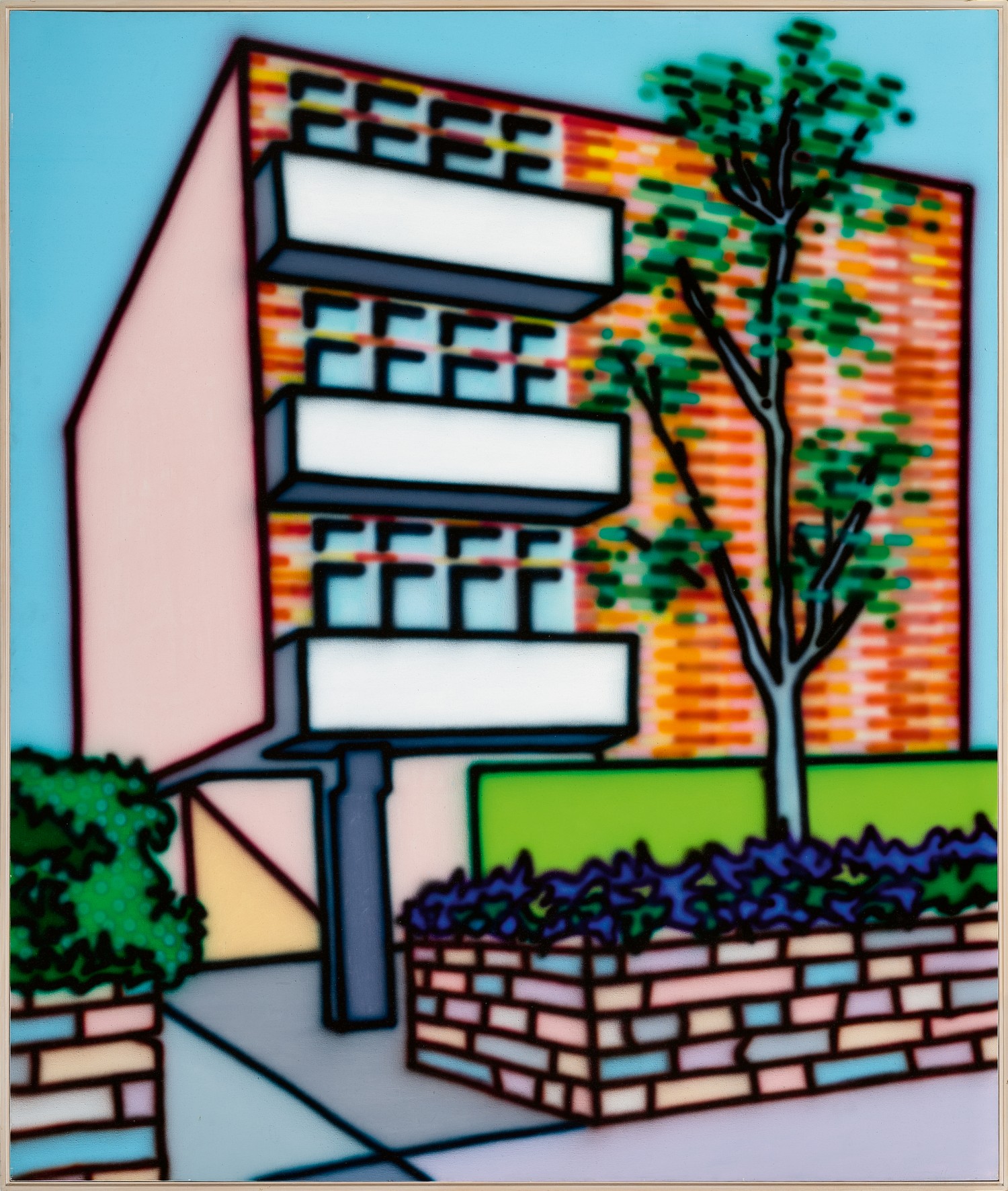 Like many of Arkley’s suburban exteriors, O.Y.O. Flats was inspired by a real estate advertisement for the sale of a ‘LIGHT AND BRIGHT’ apartment with a ‘SUNNY OUTLOOK ON LIFE’ in Rathdowne Street, North Carlton. Using the advertisement’s fine line drawing as the starting point of his painting, Arkley transposed the composition’s tight framing and somewhat lurching perspective, as well as the viewer’s vantage point from the street – filling the open white spaces of the apartment’s original ‘likeness’ with shimmering terracotta brickwork, a tessellated fence of alternating pastel hues, and large blocks of strong colour that emphasise the building’s blocky modernist form. The artist’s command of the airbrush really comes into play here, with the work’s confident black linework emphasising the block’s solidity and ‘good bones’ (to steal a real estate term), while proudly emphasising the painting’s undeniable Pop sensibility. As Arkley happily admitted, he was ‘never ever going to be a de Kooning or a John Olsen’ and he ‘was never going to love paint and wallow around in it’9: