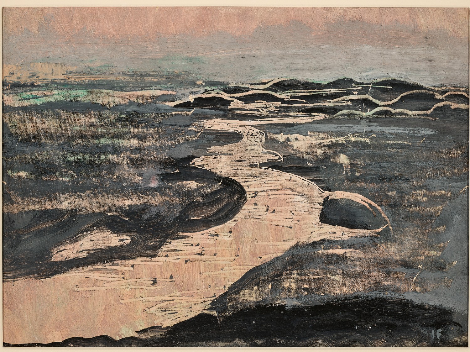 A compelling example from this period, The river, c.1954 was most likely inspired by the artist’s recollections of Huzhou, in the Yangtze River delta north of Hangzhou. As was his custom, Fairweather sent the painting to Macquarie Galleries devoid of notes, leaving the choice of title to be assigned by the gallery’s directors when it was exhibited in the annual Show of Sixes in 1956. Though abstracted in part, the composition retains an overall connection to landscape representation with its pale, winding river moving sinuously through a network of loosely drawn mountains and amorphous forms, evoking not one specific place but arguably, a composite memory of several —Huzhou, Suzhou, and possibly even Queensland. Thus, fusing memory, place and spiritual inquiry, indeed such paintings from this period unfold over the support’s surface like a stream of consciousness or ‘way of meditation’6 – betraying distant impressions of Chinese calligraphy, Aboriginal rock painting, and European Post-Impressionism.
