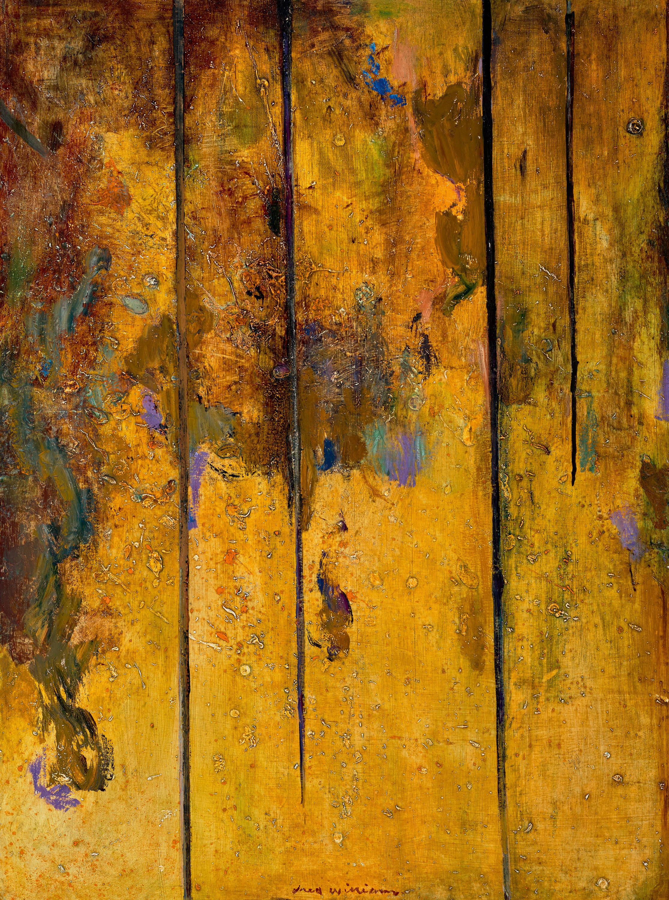 Williams’ use of glazes is an important and repeating trait – his appreciation of them gleaned through looking at the work from old masters to Corot. It is a deep historical understanding used to contemporary effect; the quickly painted gestures are a characteristic which are emphasised fully in his paintings on board. The expressive surface gestures and textures are as robust and dynamic as Australian abstract expressionist paintings at the time.