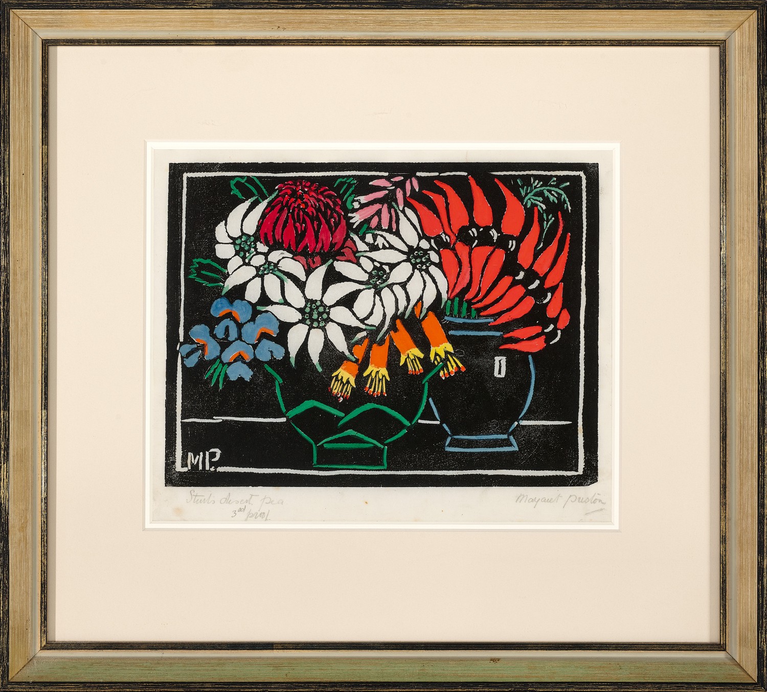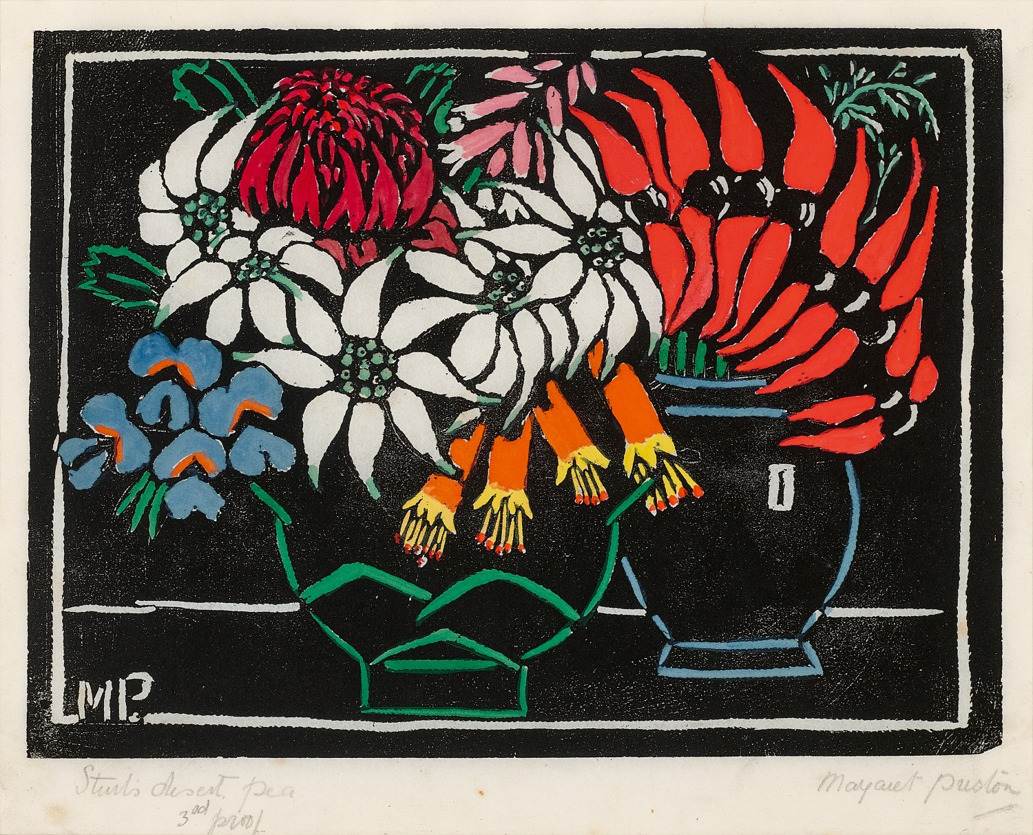 signed, numbered and inscribed with title below image: Sturt’s desert pea / 3rd proof / Margaret Preston