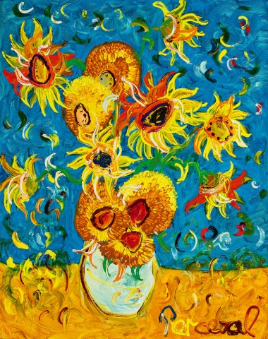 Perceval’s high-keyed palette, applied with a brush loaded with unmixed colour or in calligraphic coils straight from the tube, creates a radiant composition, swirling with energy. The artist’s emulation of plein-air impressionist techniques throughout the 1960s gave him an understanding of spontaneous and immediate painting before the subject, applying his brushstrokes authoritatively, and without revision. Leading Robert Hughes to accuse Perceval’s art of being ‘roly-poly’, the vigorous and loose gestural quality of Perceval’s brushwork became his hallmark, particularly later in life.2 Here, far removed from Van Gogh’s crisp and static composition, Perceval’s idiosyncratic touch brings a life force, making the petals of the titular sunflowers tremble, as if fluttering away in a strong breeze.