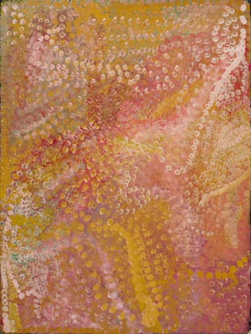 The genius of Emily Kame Kngwarreye is apparent in the way she created highly evocative paintings of great visual complexity out of deceptively simple marks with the brush. Untitled (Awelye), 1993 is painted in a varied palette of closely matched, high key tones where the overlapping brush marks create an optical density and depth that takes the eye across all parts of the canvas. The effect is to evoke the dizzying summer heat of December in the desert. Yellow, white and pink dots float in and out over a field of red, green and soft purple.