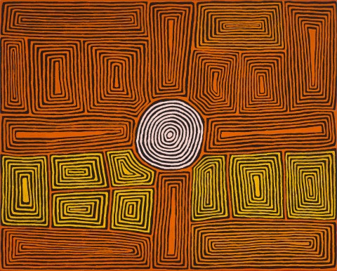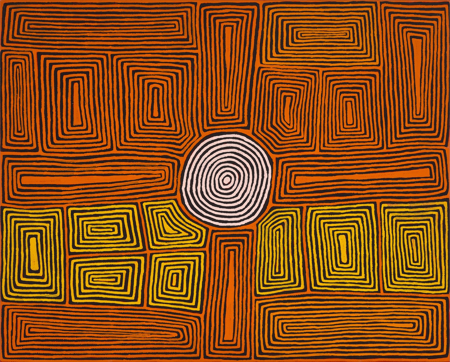 'This painting depicts designed associated with the travels of one old Tingari Man. He camped at Kampurarrpa, north of the Ehrenberg Range and applied body paint in preparation for a solo ceremony. He later travelled west to Winparrku (Mt. Webb) and then south-east to Lake MacDonald. Since events associated with the Tingari Cycle are of a secret nature no further detail was given.