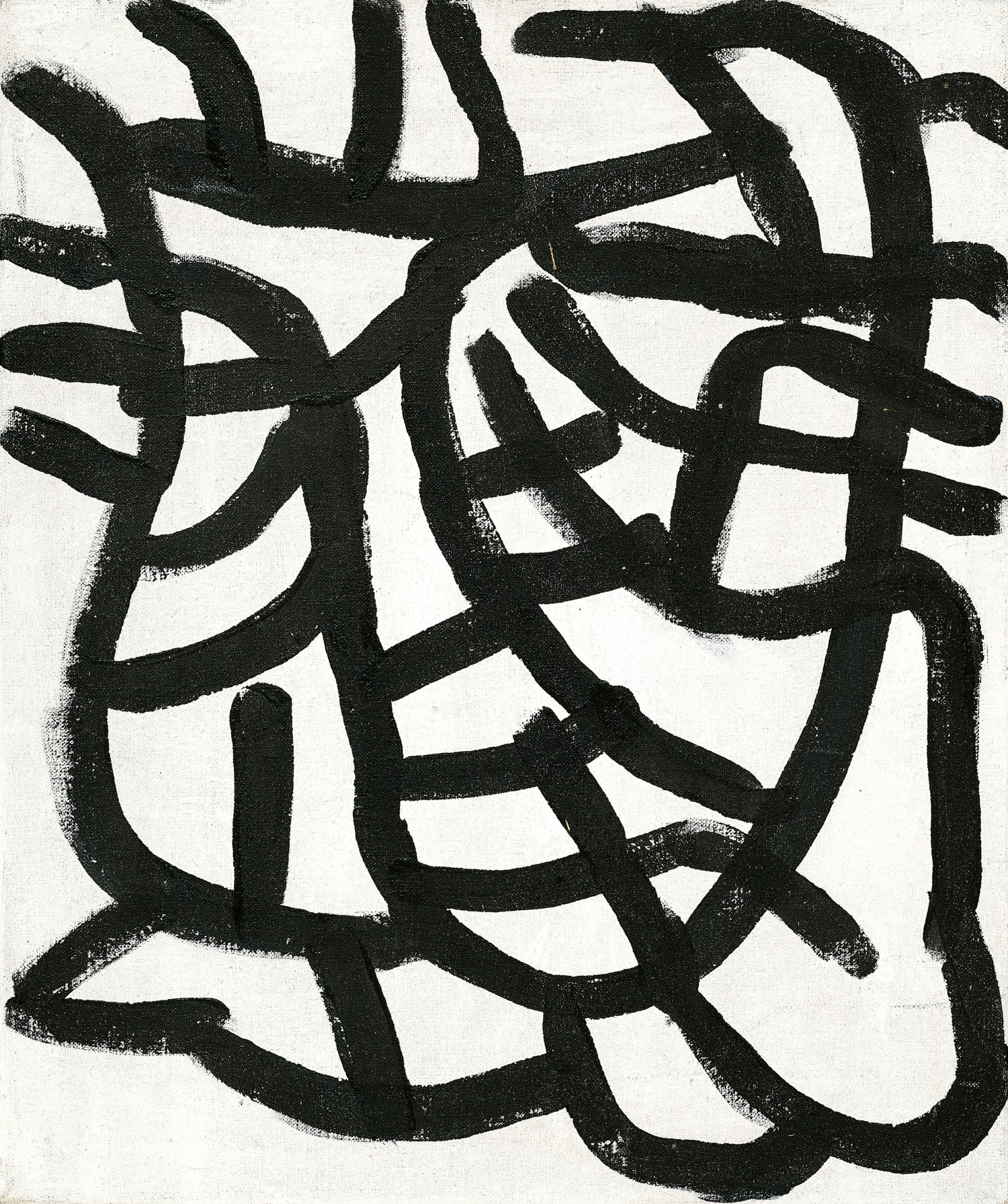 In Untitled (Yam), a single inky black tone is applied with deliberation, sweeping arcs of paint moving energetically across the modestly scaled canvas. These arcs evoke the painting’s subject: the meandering, rhizomatic roots of the Arlatyeye plant (pencil yam, Vigna lanceolata) and the fissures that appear in the earth as the yam ripens. At the same time, the gestural marks emphasise the immediacy and intimacy of the exchange between artist and canvas.