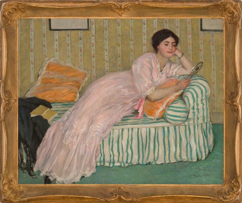 Bringing together the focus on pattern and texture and the use of harmonious colour which were primary elements of Fox’s approach to picture-making, Vanity is a masterful expression of his distinctive vision of fin de siècle femininity. Highly regarded by the artist, it was brought to Australia for display in his 1913 solo exhibitions here, catching the attention of the Sydney Morning Herald critic who described it as ‘a harmony in pink, blue and gold [and] among the outstanding pictures in the exhibition.’7 The painting was later purchased at auction by Sir Keith Murdoch and in 1979, Dame Elisabeth Murdoch donated it to McClelland Sculpture Park and Gallery.