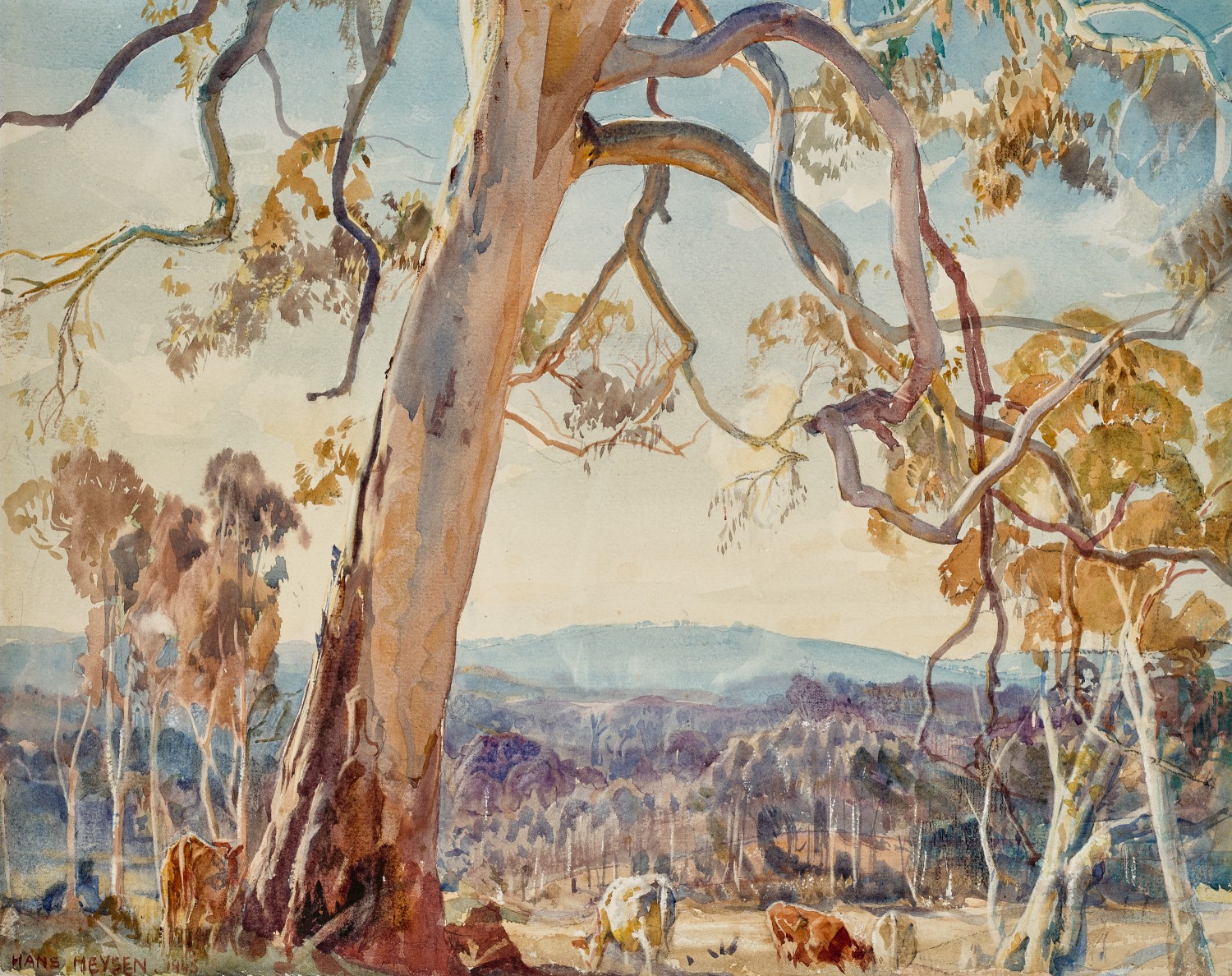 Hans Heysen’s prodigious talent was recognised early to the extent that in 1899, at the age of twenty-two, four South Australian patrons made a gift to £400 enabling him to study in Europe for four years. Upon his return, the results were immediately apparent with the Art Gallery of New South Wales purchasing The coming home, 1904, followed by Heysen’s first Wynne Prize for landscape painting that same year. He also married one of his students, Selma Bartels. In 1908, the couple (now with two daughters) moved to rented premises in Hahndorf in the Adelaide Hills. Four years later, they purchased ‘The Cedars’, a sprawling property of thirty-six acres filled with thousands of gum trees, a great number of which became central to his paintings – with the artist often returning over time to chart the changing effects of light upon them as they aged. Here he built a bespoke studio, which remains standing today as the oldest surviving example in Australia. Employing his European studies as foundation, Heysen was thus able to ‘(render) the gum tree familiar; they are like oak trees, solid, reliable citizens of the countryside.’1 The white gum, 1945, features one of these majestic trees, identified by Allan Campbell, Curator of the Heysen Collections, as being one of the artist’s ‘favoured Manna gums looking north from his property’2, here providing shade for grazing cattle, set against a background vista of scrubby forest and hills.