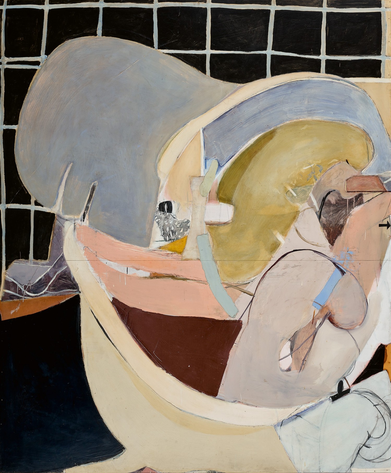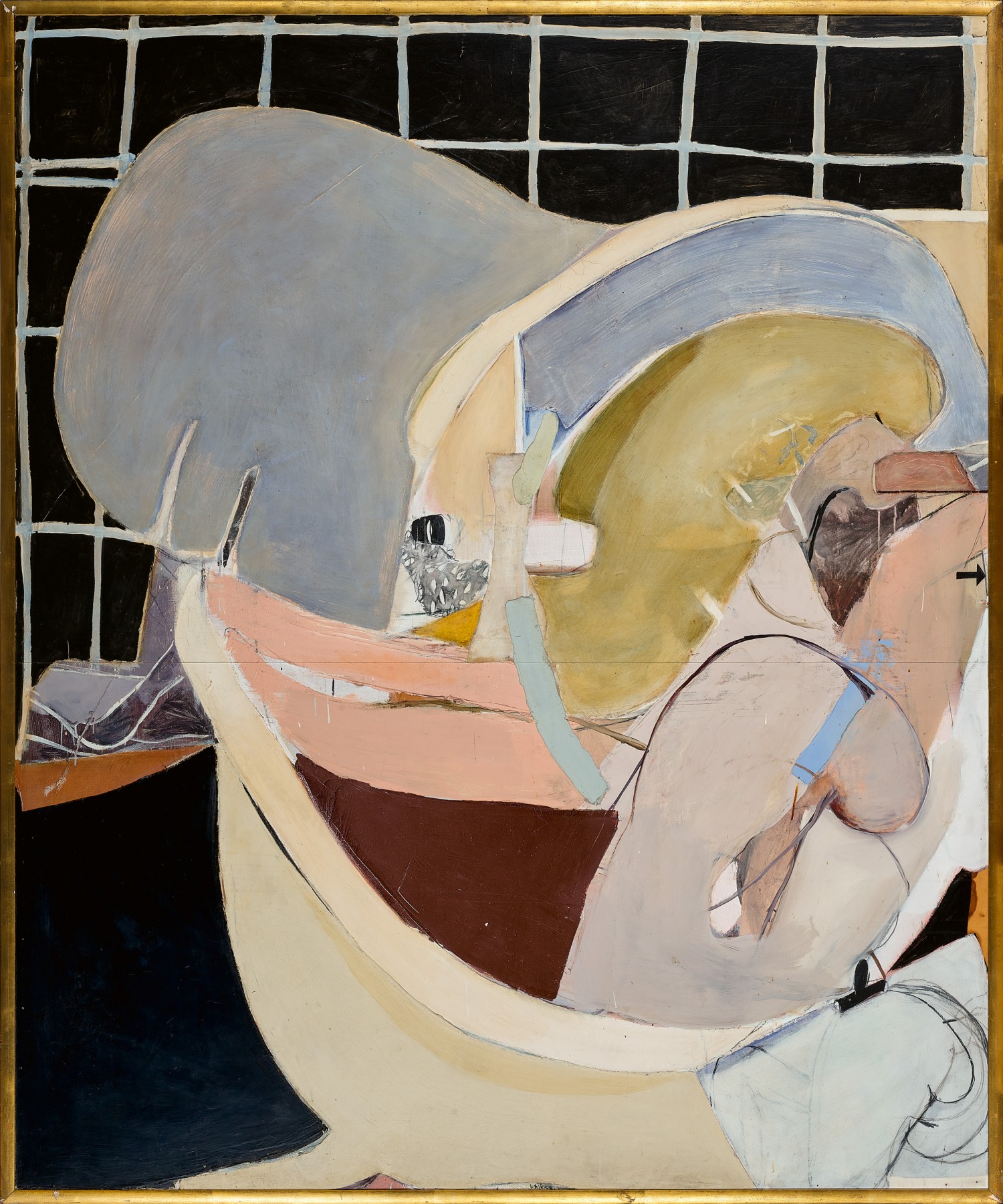 The fragmented forms within Woman in a bath 5 oscillate between representation and abstraction, the human figure not as easily discernible as in other versions of Woman in a bath. Anchored by the curved shapes of her back, Wendy’s arms move through the spray of water, creating an active and dynamic figurative composition. These textured and collaged slabs are reminiscent of the shapes within Whiteley’s earlier abstractions, which ‘yearned to become figurative’ and seemed to encapsulate a sense of passing time.3 A startling Pop Art inclusion into the picture plane – a small black arrow on the right-hand edge – indicates an attempt to depict movement and fluidity among the artist’s collection of compressed, flat shapes. A graphic device the artist would put to emphatic use in later works, such as Alchemy, 1972 – 73, the semiotic power of the arrow is explained another associated painting of the series, Bather showing arm movement, 1963, where at least five arrows are arranged in a clock-wise formation atop the centre of the painted image, accompanied by a note handwritten in pencil on the picture plane ‘arrows show the arm movement’. As noted by the critic from the Times reviewing the suite of Bathroom paintings when they were exhibited in Marlborough Galleries in April 1964, Whiteley’s emphasis on the flat and compact functionality of the apartment’s bathroom, devoid of ‘decorative overtones’, emphasised the ‘sensuous impact of the movements of the human body which occupies it.’4