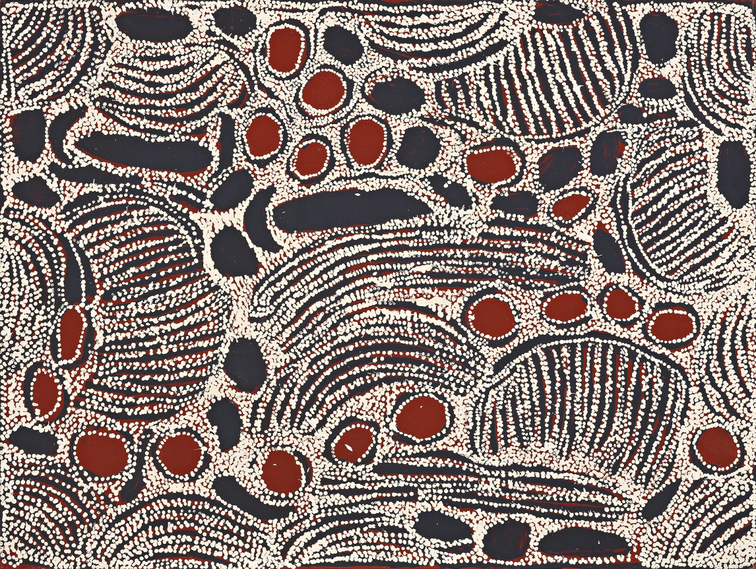 While at the site the women also gathered the edible berries known as kampurarrpa or desert raisin from the small shrub Solanum centrale. These berries can be eaten straight from the bush but are sometimes ground into a paste and cooked in the coals to form a type of damper. The small circles in this painting represent these kampurarrpa.