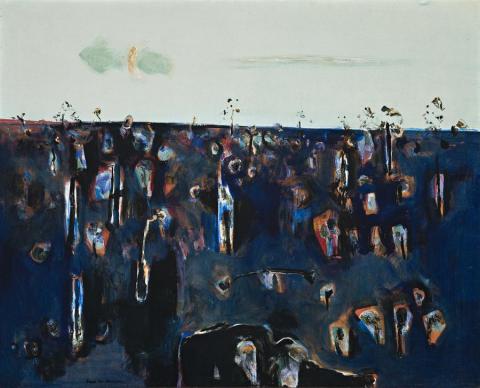 signed and dated lower right: Coburn 92 inscribed verso: JOHN COBURN / "DESERT STORM" / OIL 1992