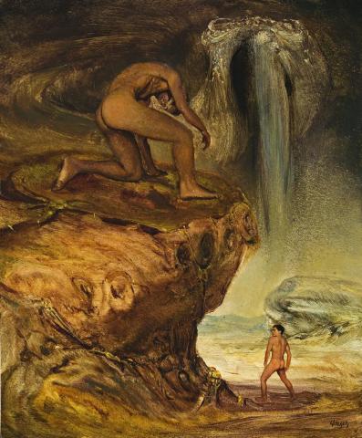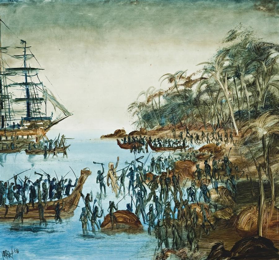 signed and dated lower left: PRO / HART 68 signed, dated and inscribed on label verso: "Study for the Death of Cook" / ... / 26.3.68 / Pro Hart