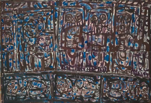 In 1963, Fairweather was one of seven artists including John Perceval, Albert Tucker and Leonard Hessing selected to represent Australia at the VII Bienal de São Paulo. Although he was more than twenty years older than all his fellow Australian exhibitors – and the only one who was born in the nineteenth century – his work was utterly contemporary and very at home in such company. He showed four paintings: Shalimar, Portrait of the Artist, 1961 – 62 (National Gallery of Australia); Night Life, 1962 (private collection); and this work, Jetty, 1962 which was lent from the collection of Douglas and Margaret Carnegie.2 This selection reflected the tension that exists between representation and abstraction in Fairweather’s art. While the portrait and Night Life clearly reveal their figurative subjects, Shalimar, composed of at least seventy layers of paint, appears completely abstract.3 At first glance, Jetty also seems like an all-over composition of brushstrokes in vivid shades of blue, applied on top of a lively ground of linear and painterly marks. The title of the work provides a clue of course and closer inspection reveals that the sequence of black lines in fact describes a simple jetty, its support structure depicted in the lower left of the picture and its long narrow form roughly dividing the composition in half. Like much of Fairweather’s art, Jetty emphasises the act of painting and the physicality of his expressive style. It also reflects the notion proposed by Murray Bail that Fairweather ‘articulated mood’4, here, artfully conjuring up the sight, sound, smell and calming effect of water rhythmically lapping against a wooden jetty.