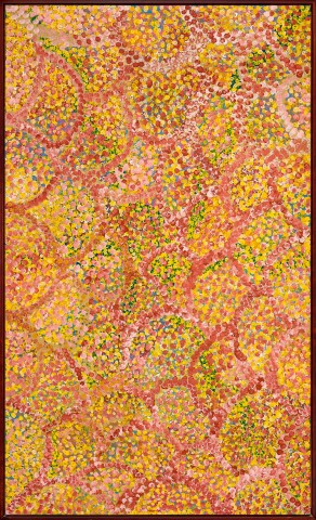 Stylistically, Yam country, 1993 echoes a number of remarkable earlier paintings executed in 1990 and 1991. Notably, it was created in January of 1993, during a summer which was memorable for below-average rainfall and shortage of water across the country – with the drought felt particularly keenly in the Simpson Desert and Central Australia regions including at Utopia, a land characterised as a broad, flat area of desert covered by windswept sand hills and little vegetation. Offering a bright, joyous celebration of this land’s resilience, Yam country focuses upon the imminent burgeoning of the yam seed, the bush potato from which Kngwarreye derived her name. The underlying graphic matrix of meandering lines mirrors the subject – the rhizomatic roots of the Anwerlarr (the pencil yam, Vigna lanceolata) – painted here in bold red lines and semi-covered by superimposed dotting and broad stippled blotches that systematically weave across the surface of the painting. Occupying a unique transitionary place in the development of Kngwarreye’s technique with disparate compositional and stylistic devices coexisting on the one canvas, indeed the work represents an apt symbolic expression of the swift seasonal changes about to animate the desert landscape of the artist’s country.