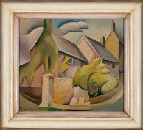 They made day trips to Corfe Castle and to nearby swimming spots, including Chapman’s Pool which she depicted in a 1935 linocut, but staying in the village of Worth Matravers it was the limestone cottages that captured Black’s attention and which feature both here in Dorset cottages, 1935 and another related painting. The present work, thought to be the first she made of the subject, was painted in Salisbury following the visit to Dorset. Using a subdued palette of earthy colours, it describes the simple form of the cottages as they step up the hill, their angular architectural geometry contrasting with the stylised clouds and bushes, and the dramatic curve of the path which sweeps across the foreground, containing the view and introducing a sense of dynamic movement to the composition.
